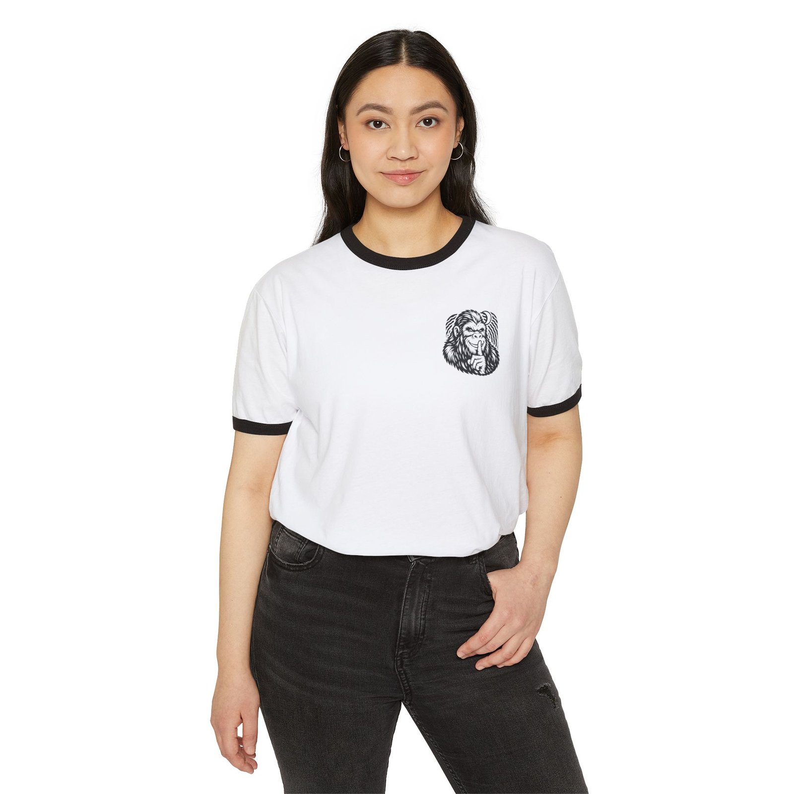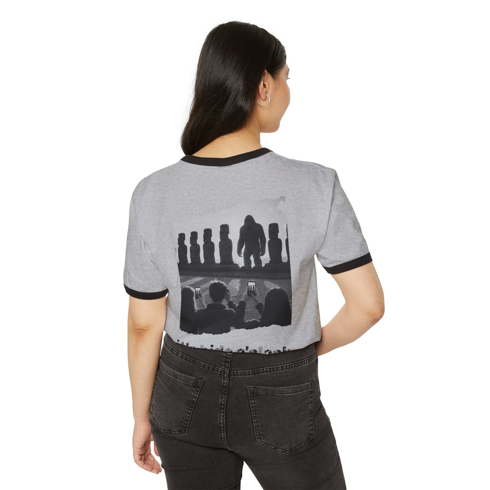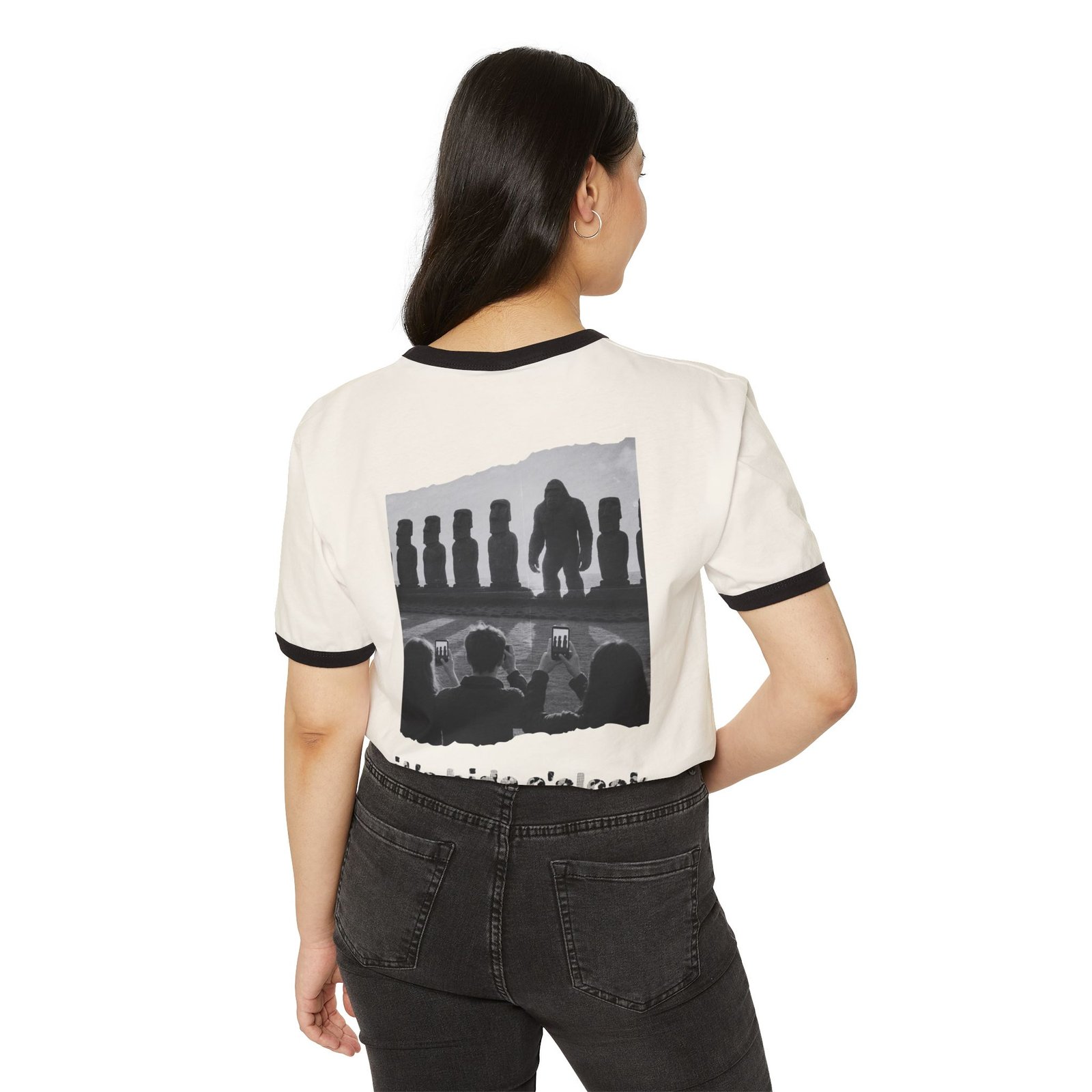 Made with 100% combed, ring-spun cotton, this ringer tee is soft, breathable, and built for everyday wear. The contrasting ribbed collar and sleeve bindings give it a classic retro vibe, while the distressed back print turns it into a wearable story—perfect for those who believe Bigfoot hides in plain sight.