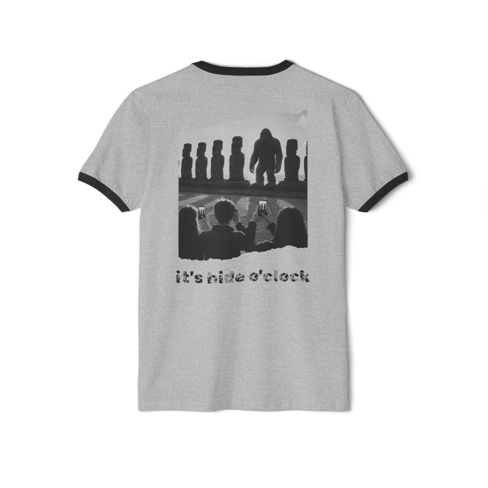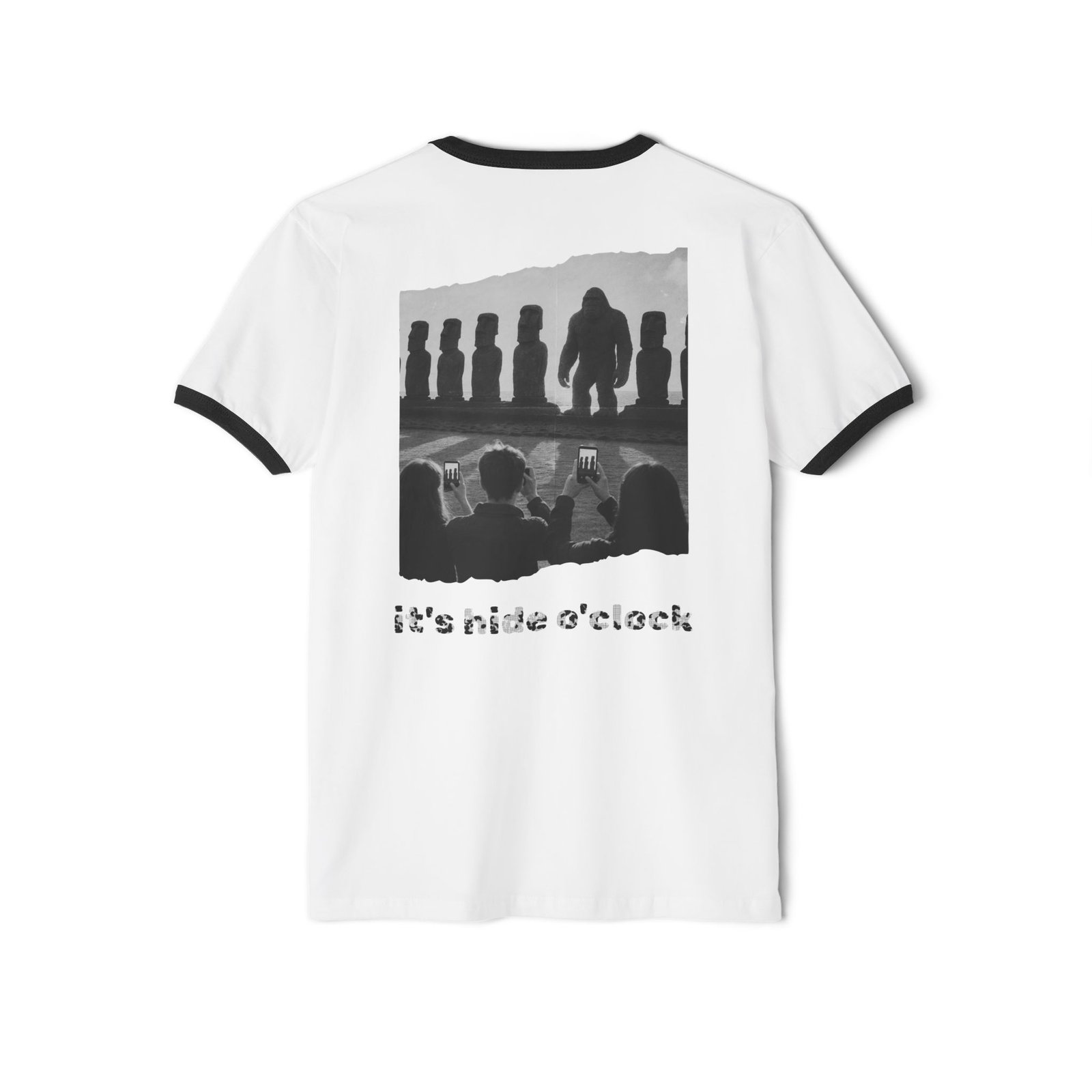 On the front: a subtle patch-style chest graphic of Bigfoot smiling mischievously and saying “shhh.” On the back: a bold, distressed black-and-white “photo” design of Bigfoot standing among the Moai statues. Tourists snap his picture, but in a surreal twist, the images on their phones show only moai statues—as if Bigfoot is being instantly erased from existence. Beneath the graphic, the text reads “It’s Hide O’Clock.”