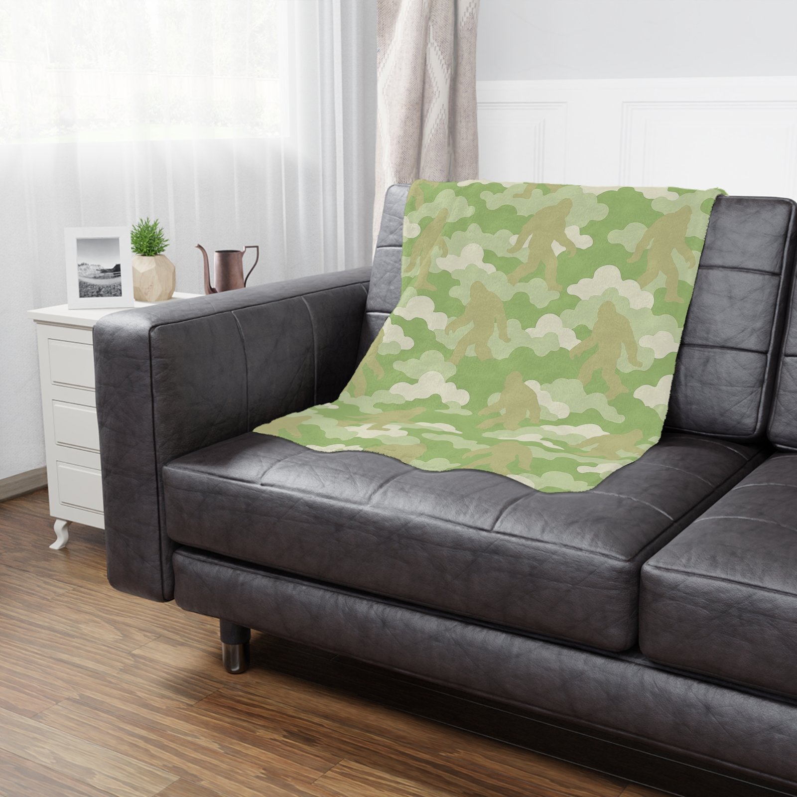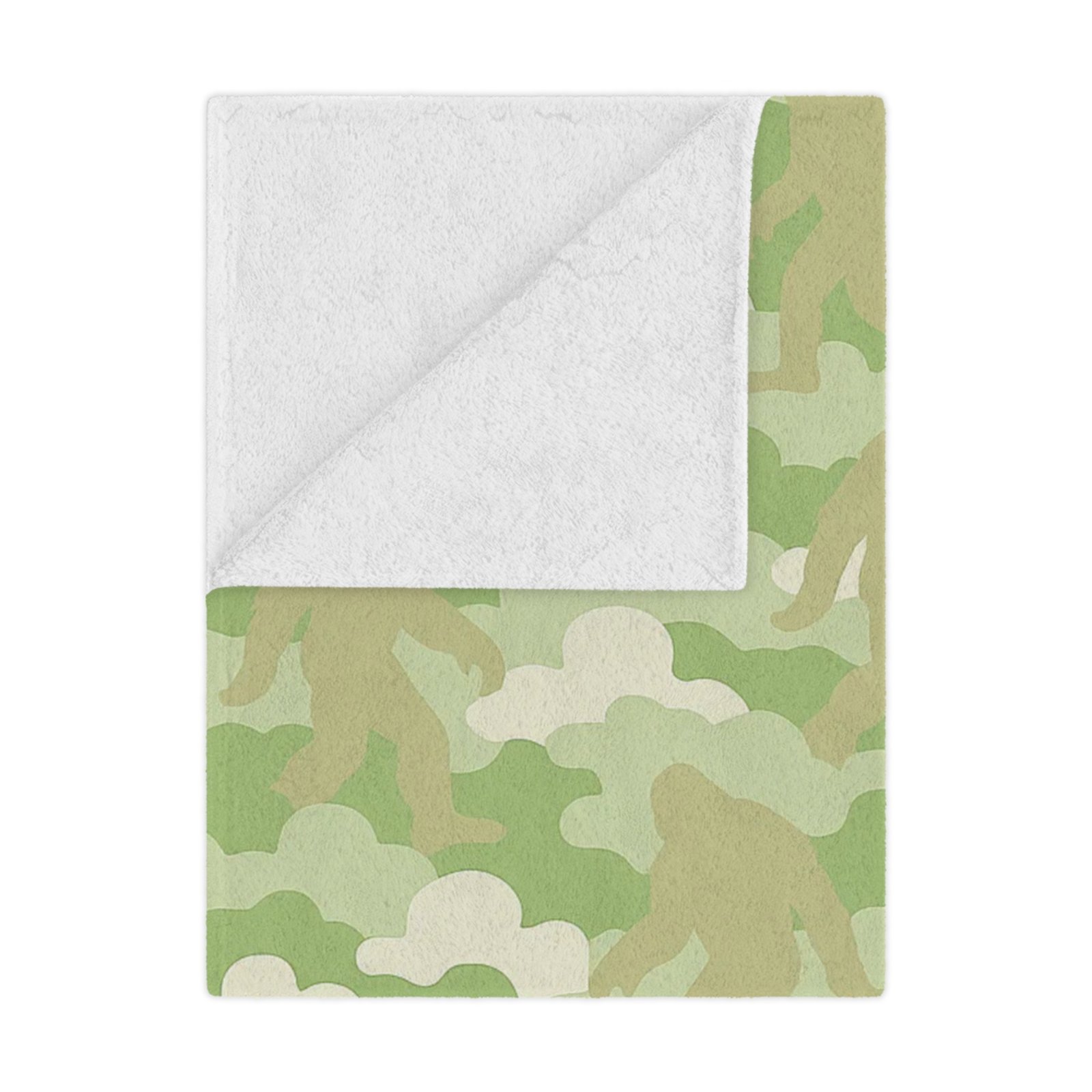 Green Camo ‘Mossy Mystery’ Minky Blanket Cloud Camo Ultra Soft Fleece Throw with Sasquatch details | 30×40 & 50×60