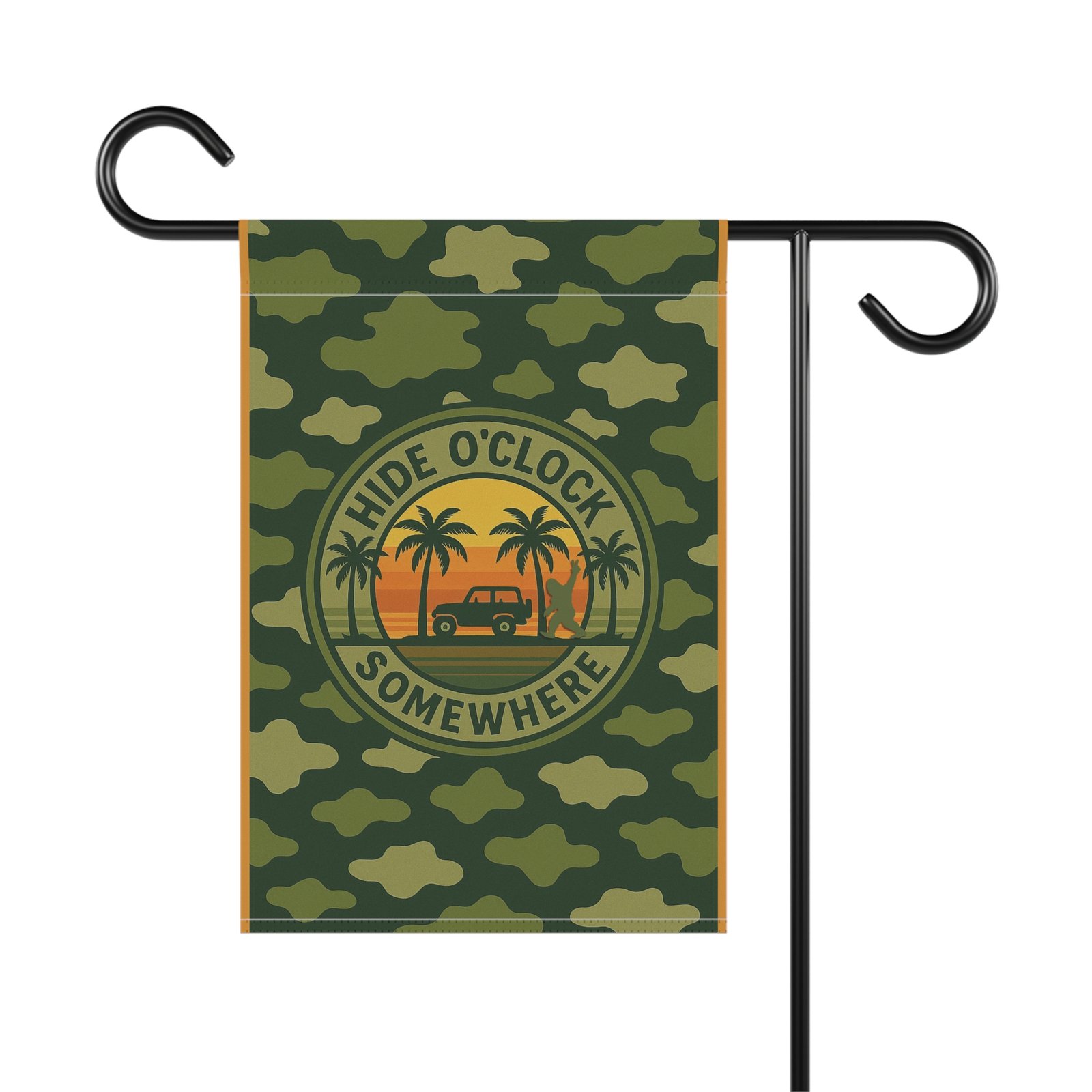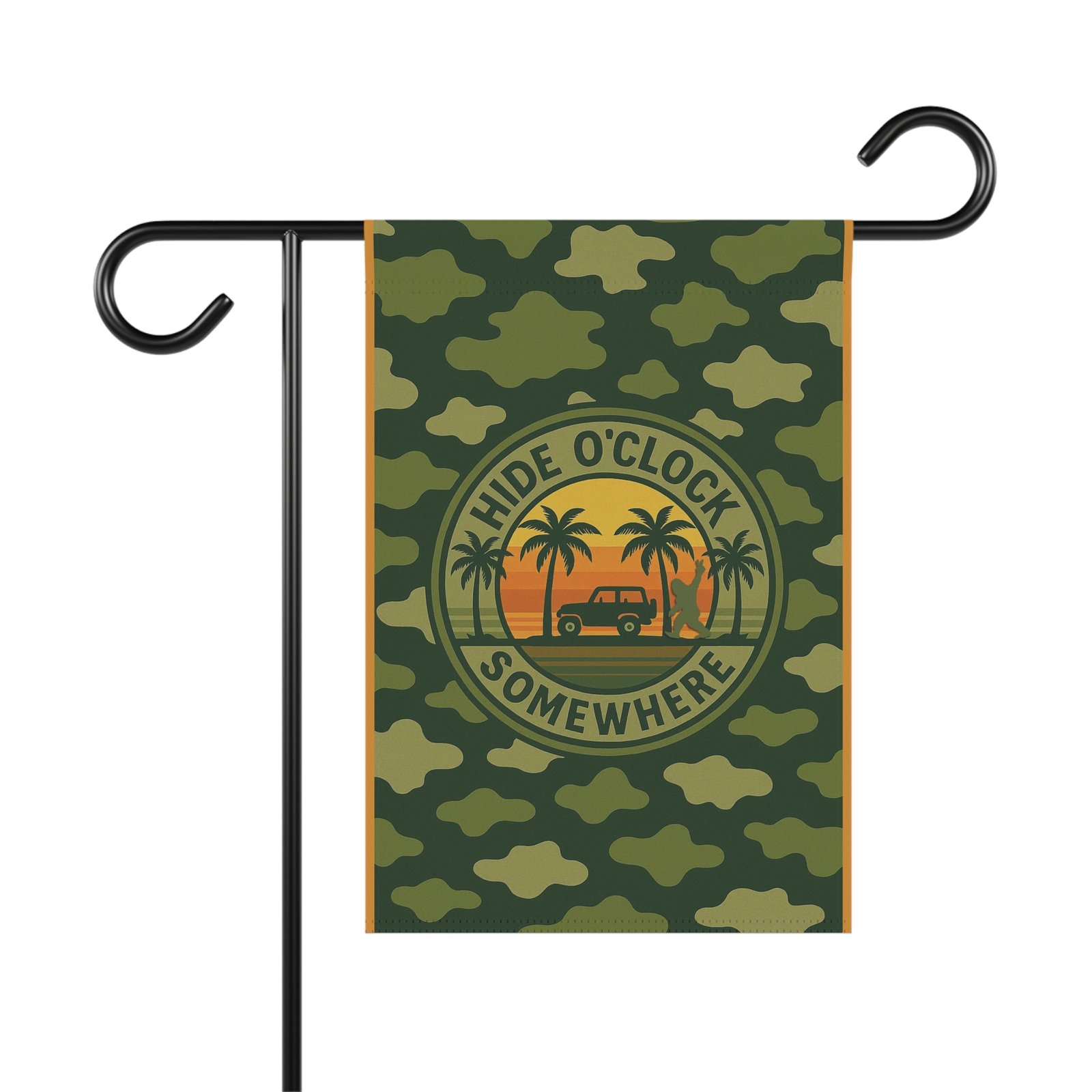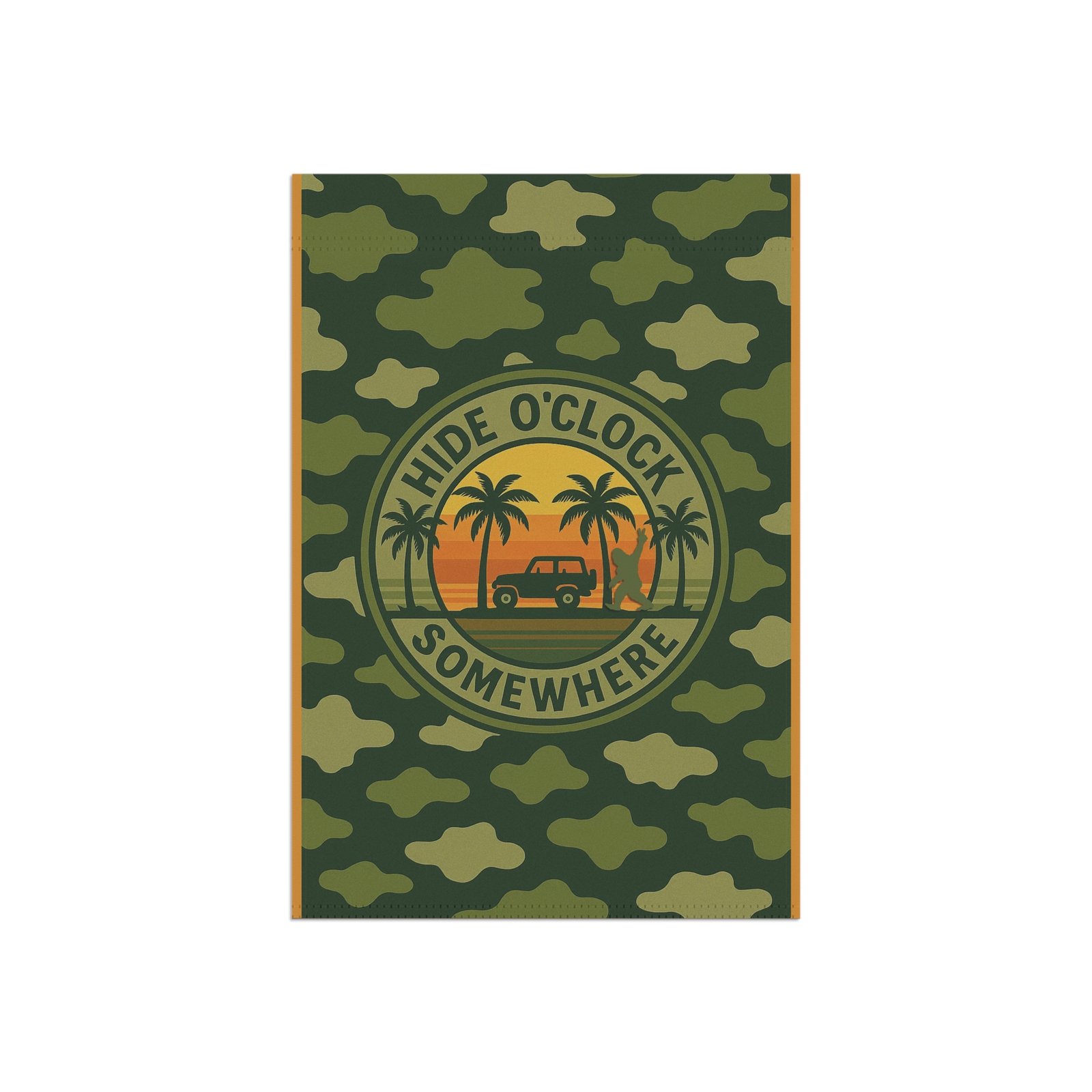 Bring mystery and style to your yard with the Hide O’Clock Somewhere green camo and orange garden flag. Featuring a rugged green camouflage background accented with bold orange borders and a glowing orange sunset, this flag embodies outdoorsy Jeepin’ adventures. Look closely—you’ll spot a Bigfoot silhouette flashing a peace sign, a playful Easter egg to make you and your guests smile.
