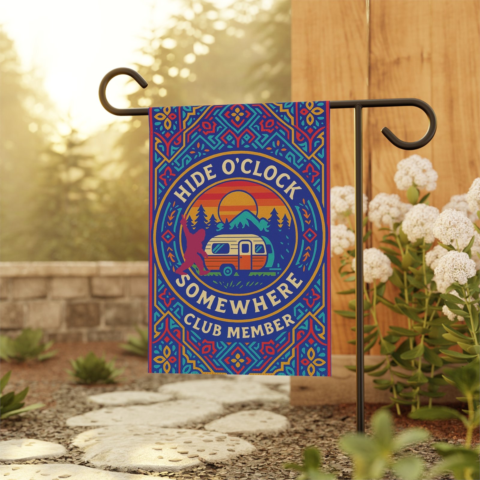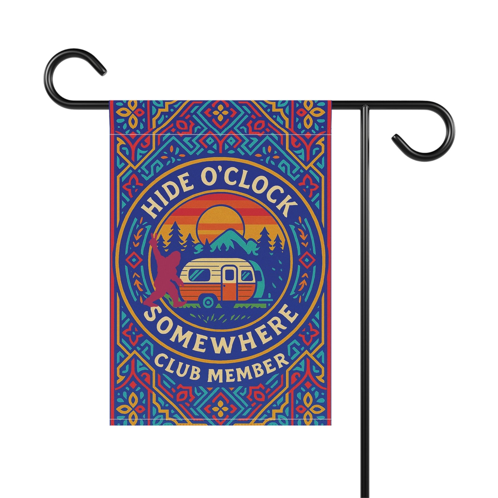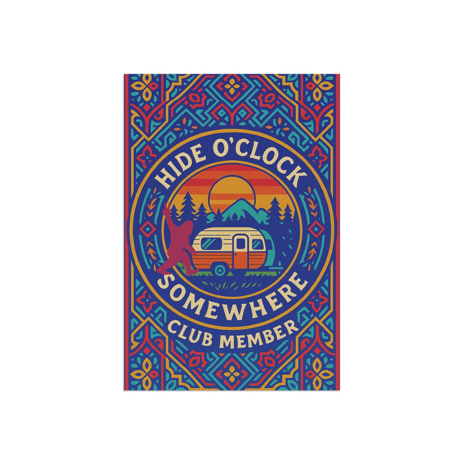 Fly your membership proudly with the Hide O’Clock Somewhere Club Member Garden Flag. Designed with a vibrant ornamental card-style motif, this bold outdoor banner features vibrant colors, a warm sunset, and a camper – your favorite Hide O’Clock Hideout. The centerpiece reads “Hide O’Clock Somewhere Club Member”…and if you look closely, you’ll spot a fun Bigfoot silhouette easter egg tucked into the design.