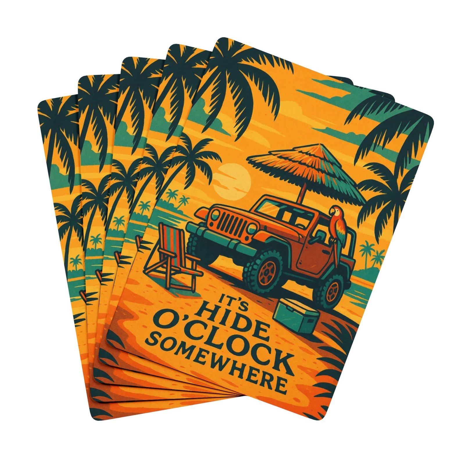 Adventure meets relaxation with the Jeep x It’s Hide O’Clock Somewhere Playing Cards. This custom deck showcases a Jeep by the ocean, a parrot perched proudly on the hood, and a glowing sunset backdrop that sets the mood for fun. Designed with Hide O’Clock flair, it’s a beachy twist on traditional card games and a must-have for Jeep fans who live for the ride and the view.