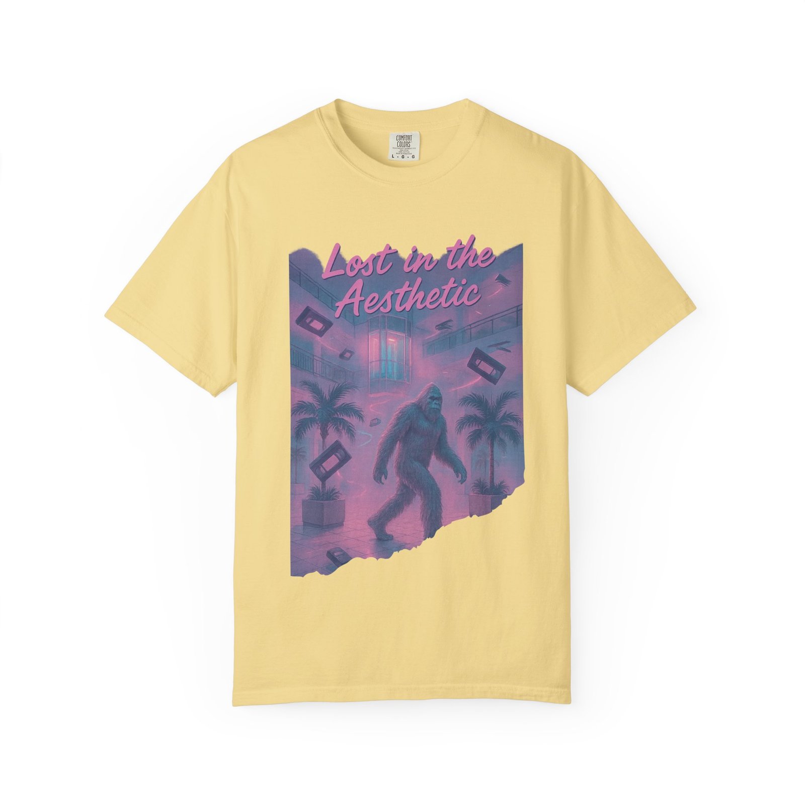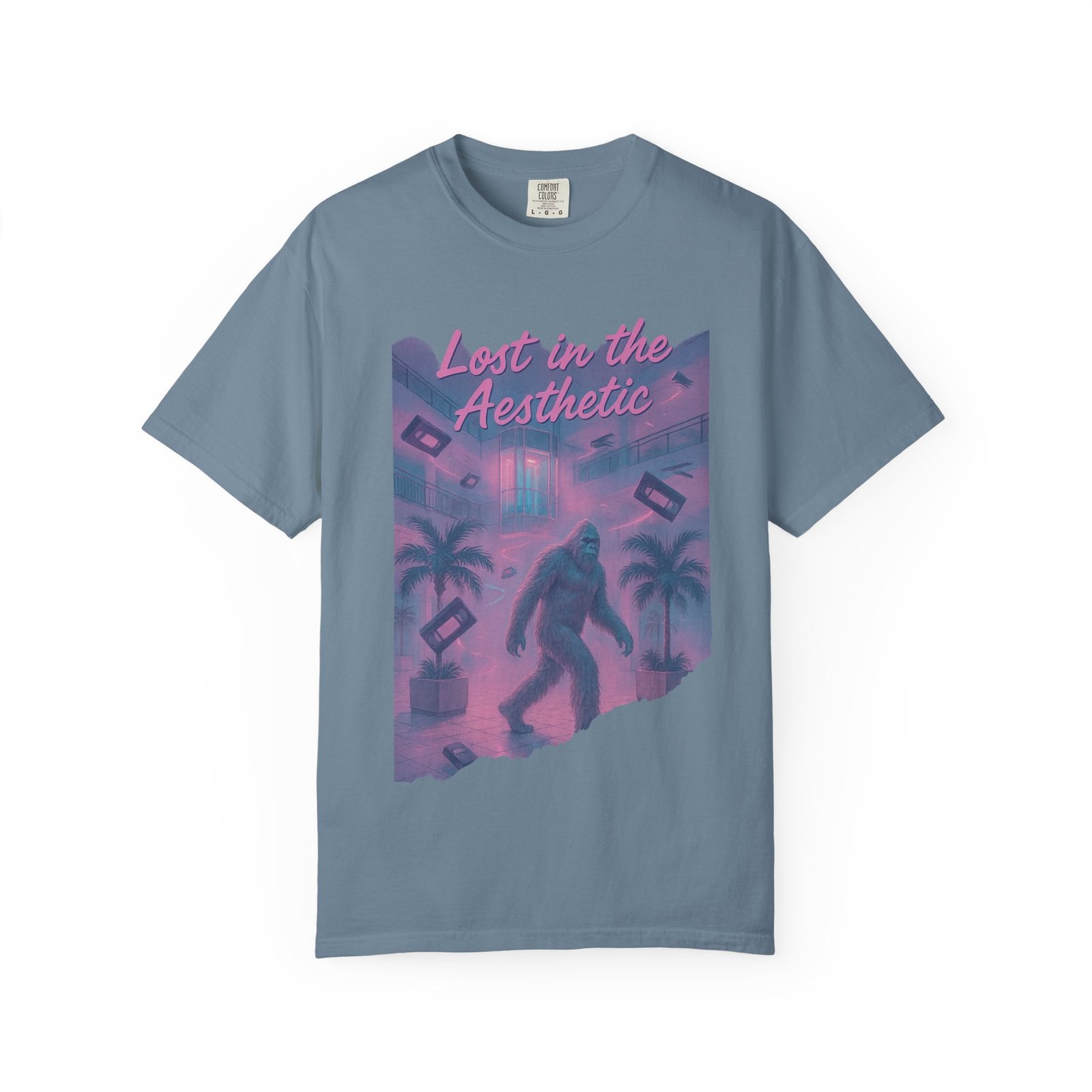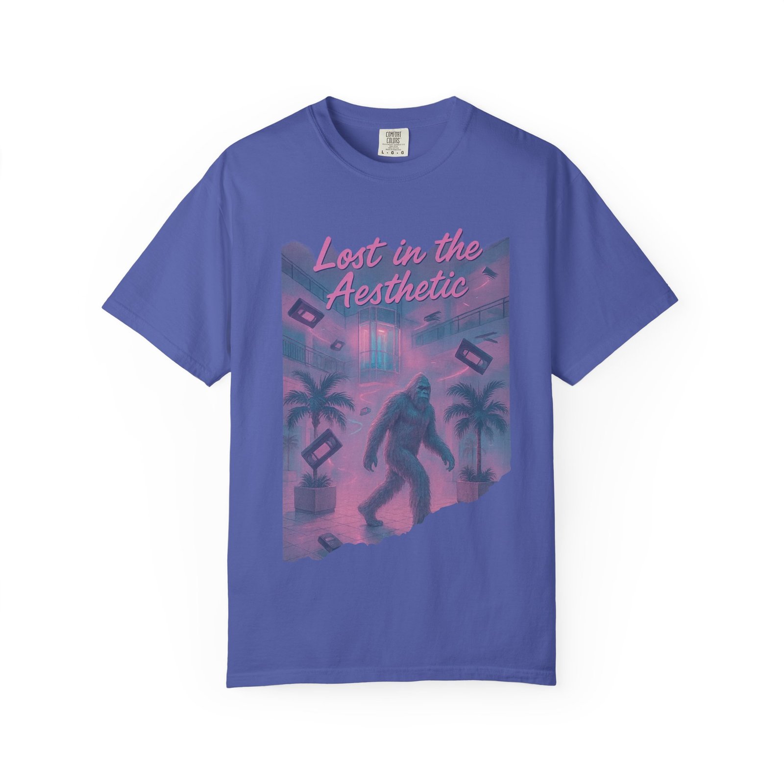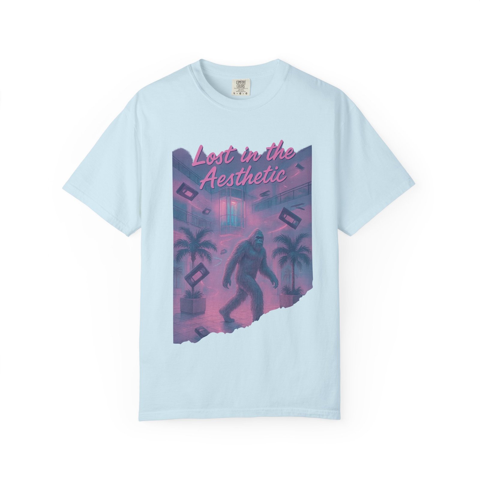 Step back into the pastel haze of the 80s with the “Lost in the Aesthetic” Vaporwave Bigfoot Tee, printed on the legendary Comfort Colors® 1717 garment-dyed t-shirt. This surreal design features Bigfoot drifting through an abandoned shopping mall, with palm trees in planters, glowing glass elevators, floating VHS tapes, and vapor trails in a dreamlike haze. The retro text “Lost in the Aesthetic” completes the scene.