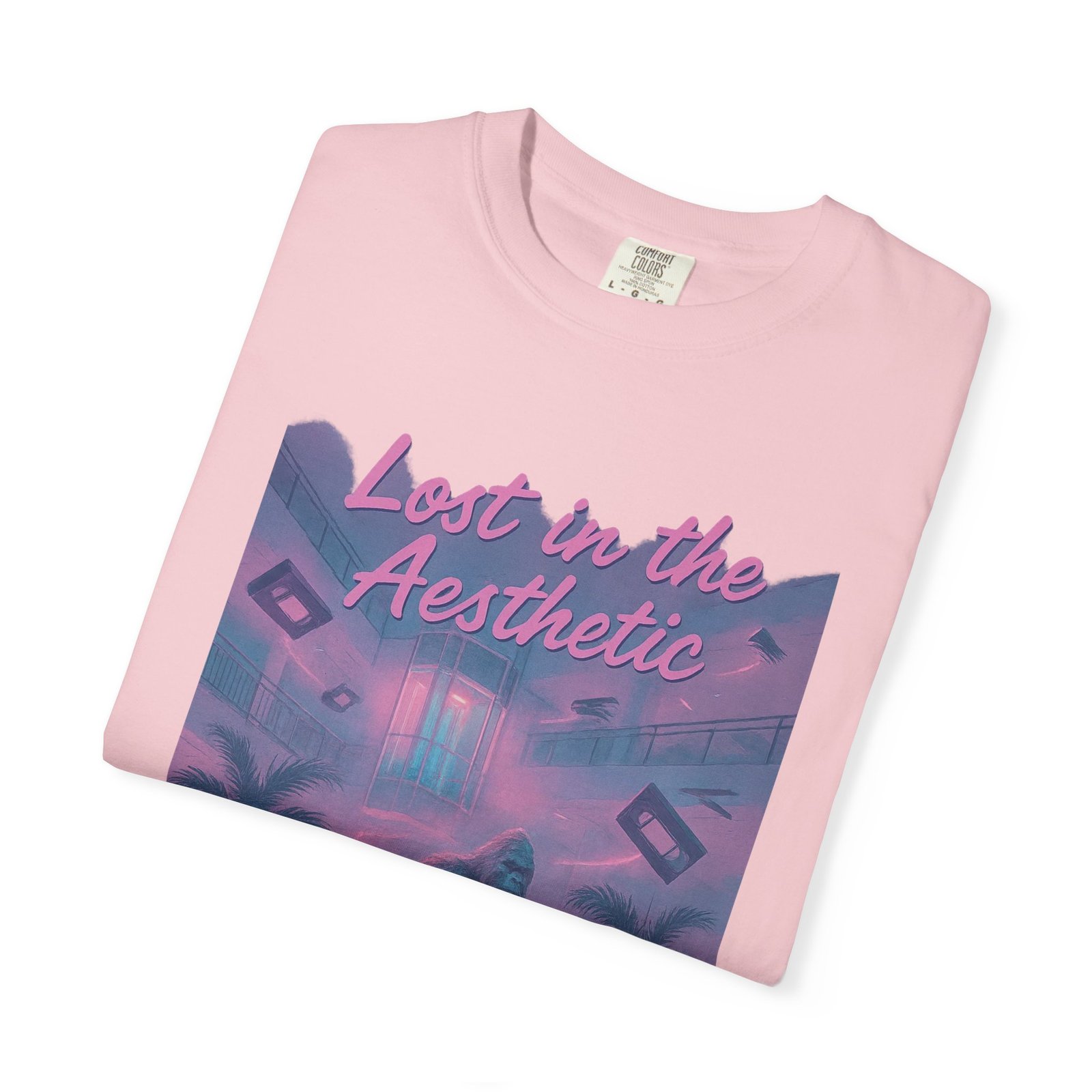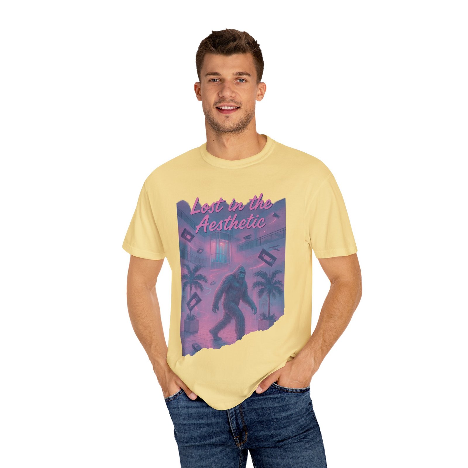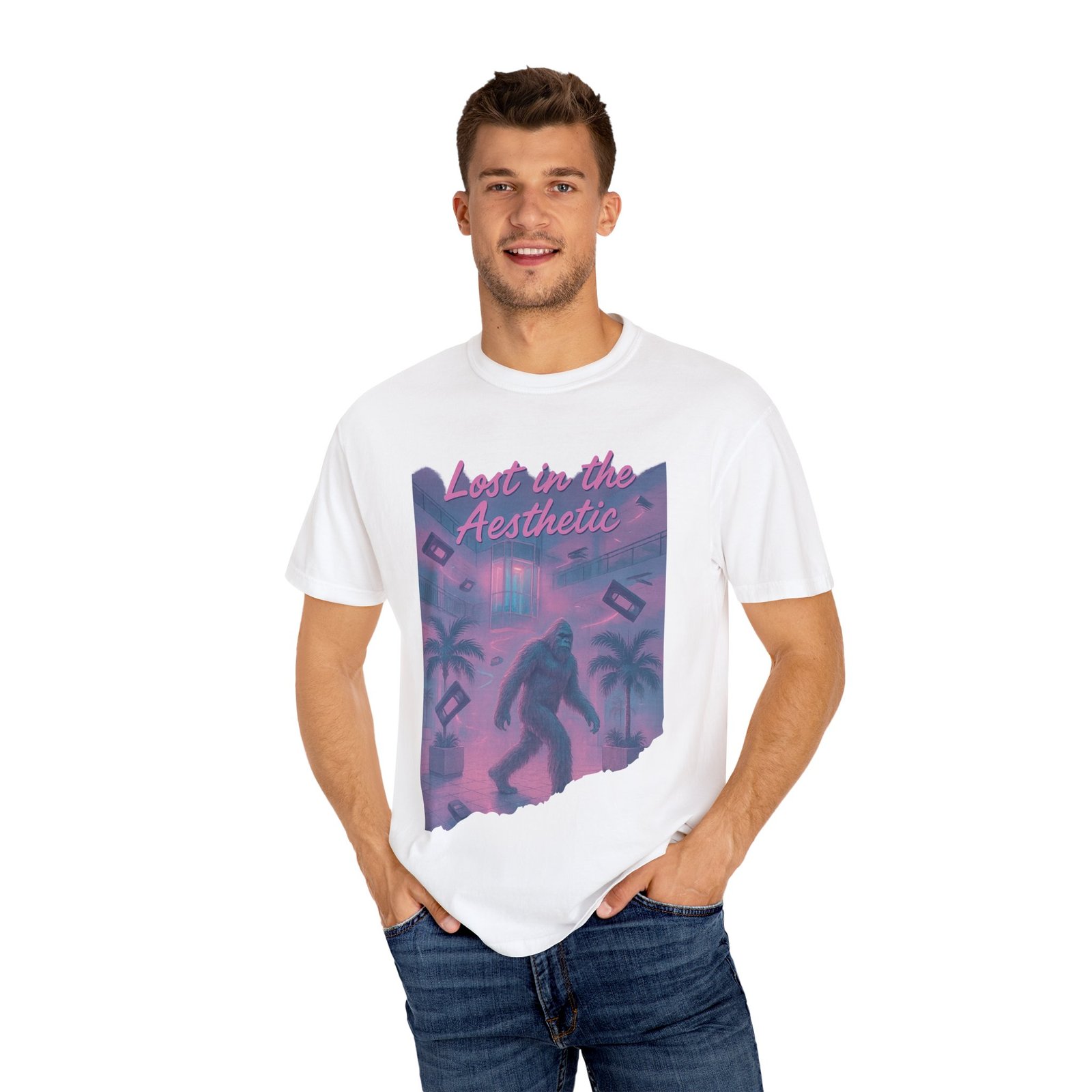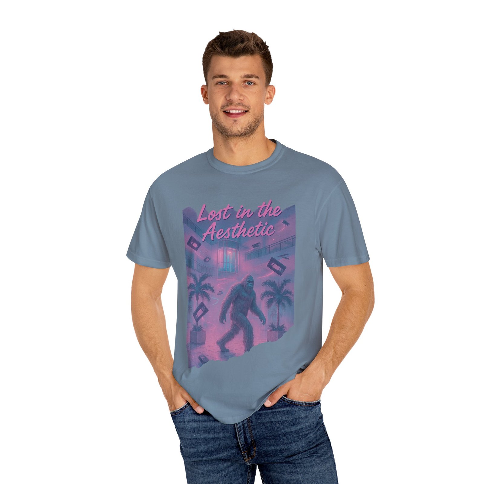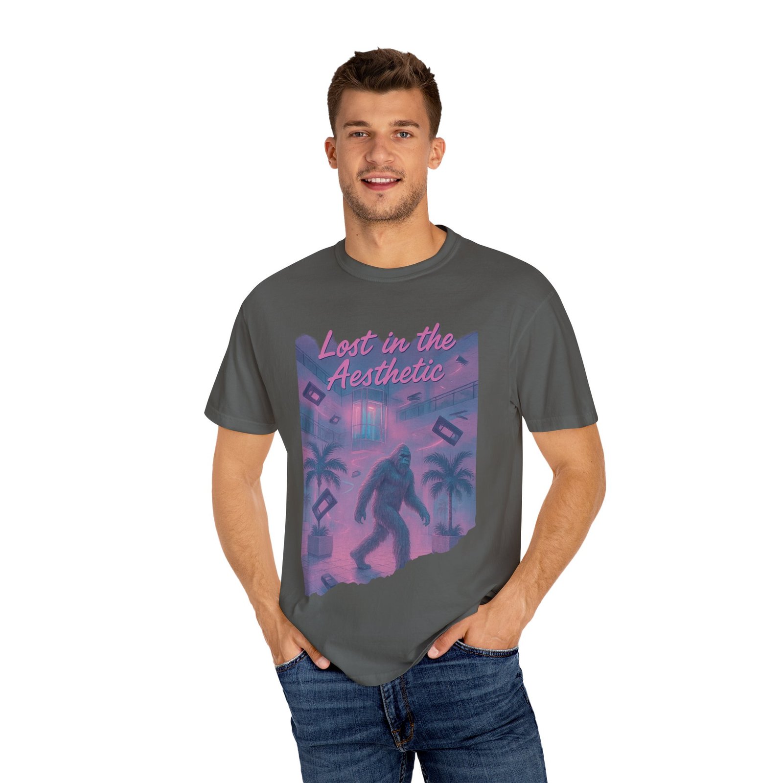 Step back into the pastel haze of the 80s with the “Lost in the Aesthetic” Vaporwave Bigfoot Tee, printed on the legendary Comfort Colors® 1717 garment-dyed t-shirt. This surreal design features Bigfoot drifting through an abandoned shopping mall, with palm trees in planters, glowing glass elevators, floating VHS tapes, and vapor trails in a dreamlike haze. The retro text “Lost in the Aesthetic” completes the scene.