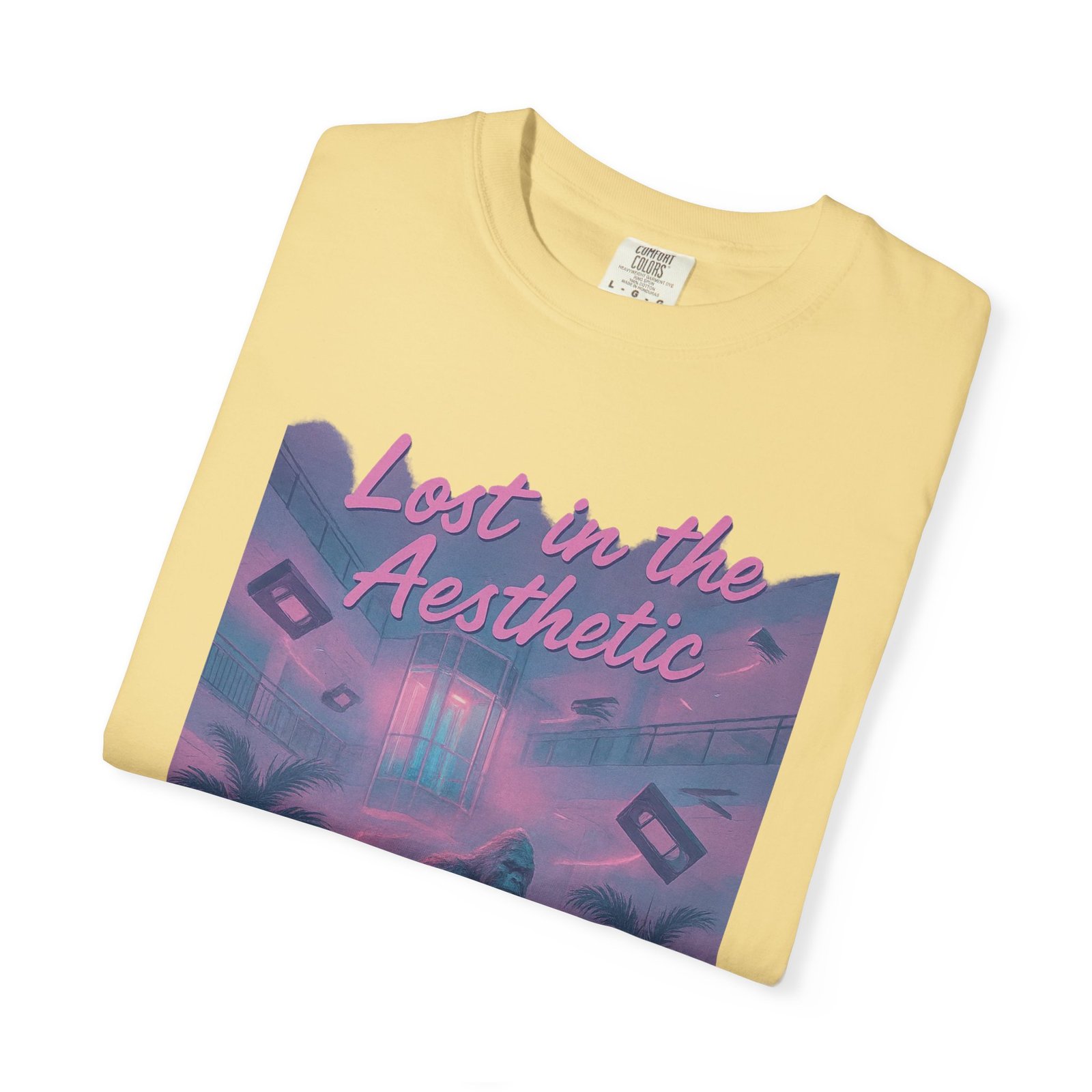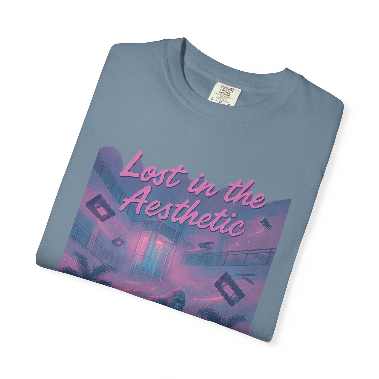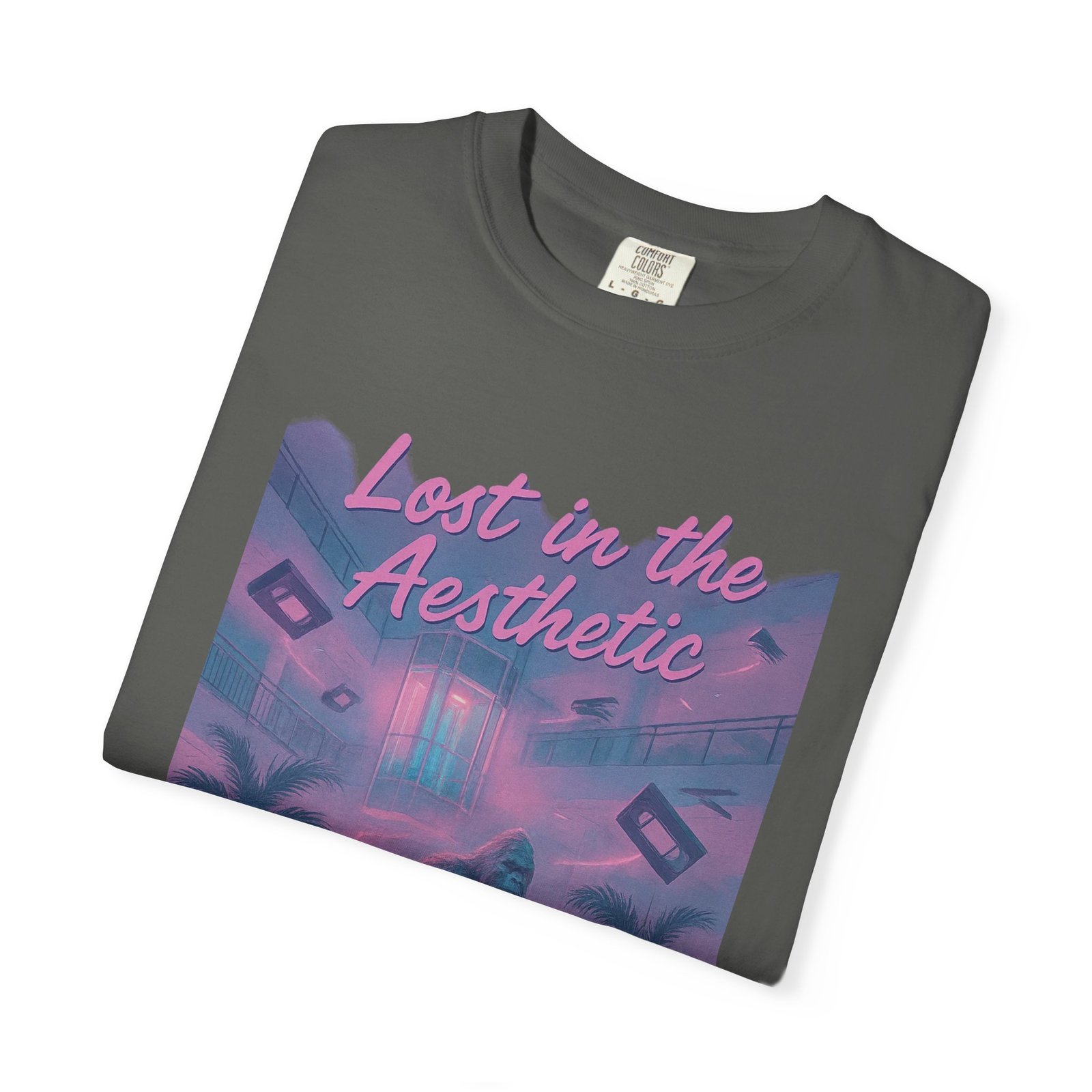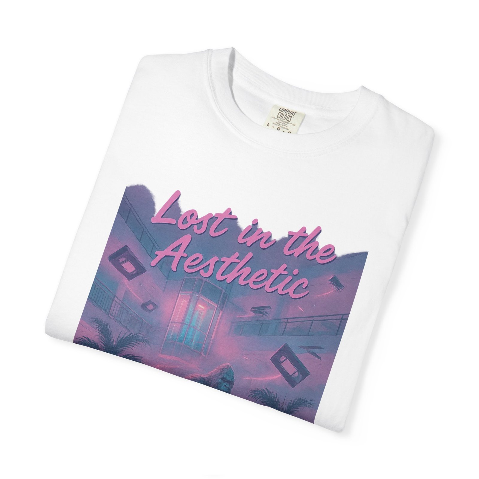 Step back into the pastel haze of the 80s with the “Lost in the Aesthetic” Vaporwave Bigfoot Tee, printed on the legendary Comfort Colors® 1717 garment-dyed t-shirt. This surreal design features Bigfoot drifting through an abandoned shopping mall, with palm trees in planters, glowing glass elevators, floating VHS tapes, and vapor trails in a dreamlike haze. The retro text “Lost in the Aesthetic” completes the scene.