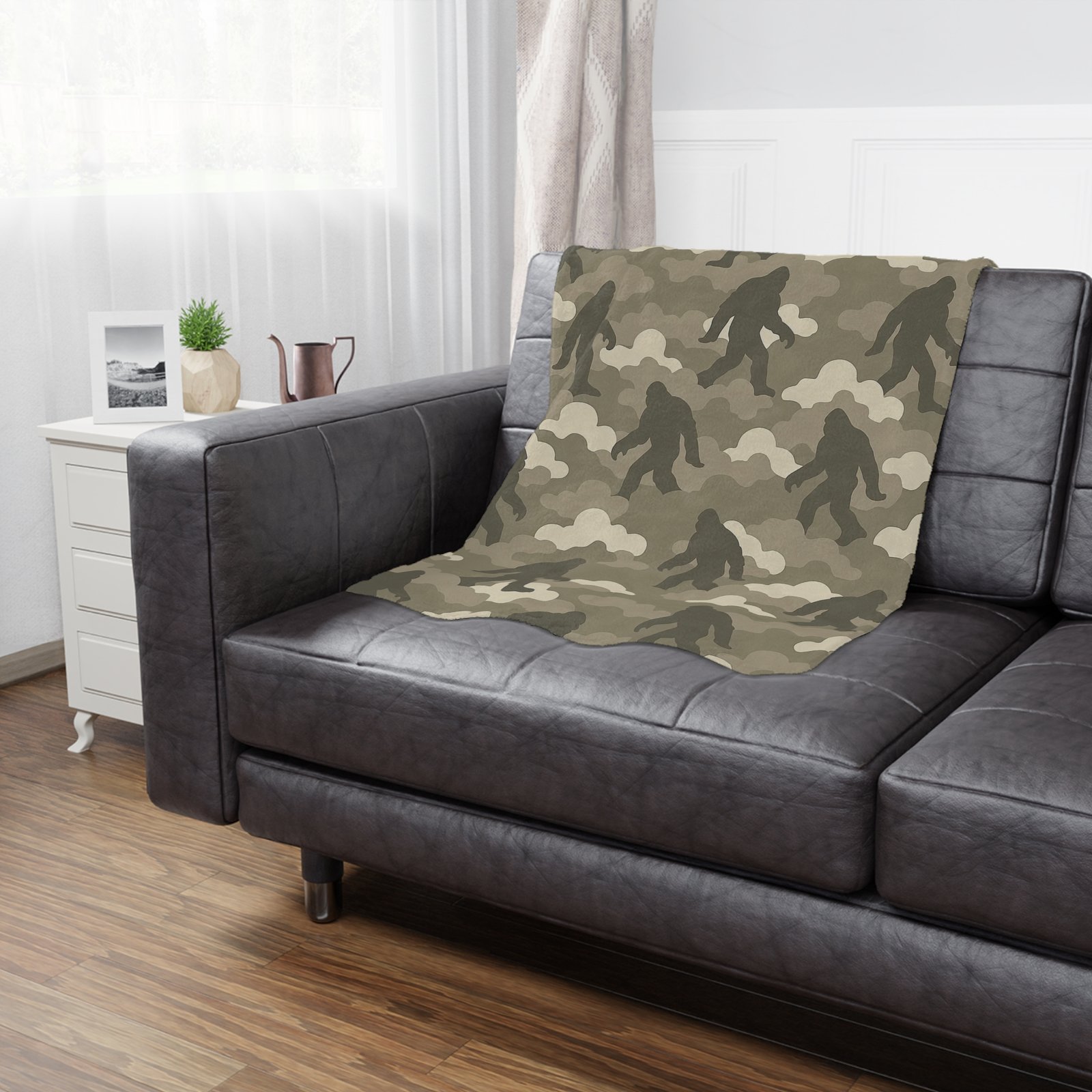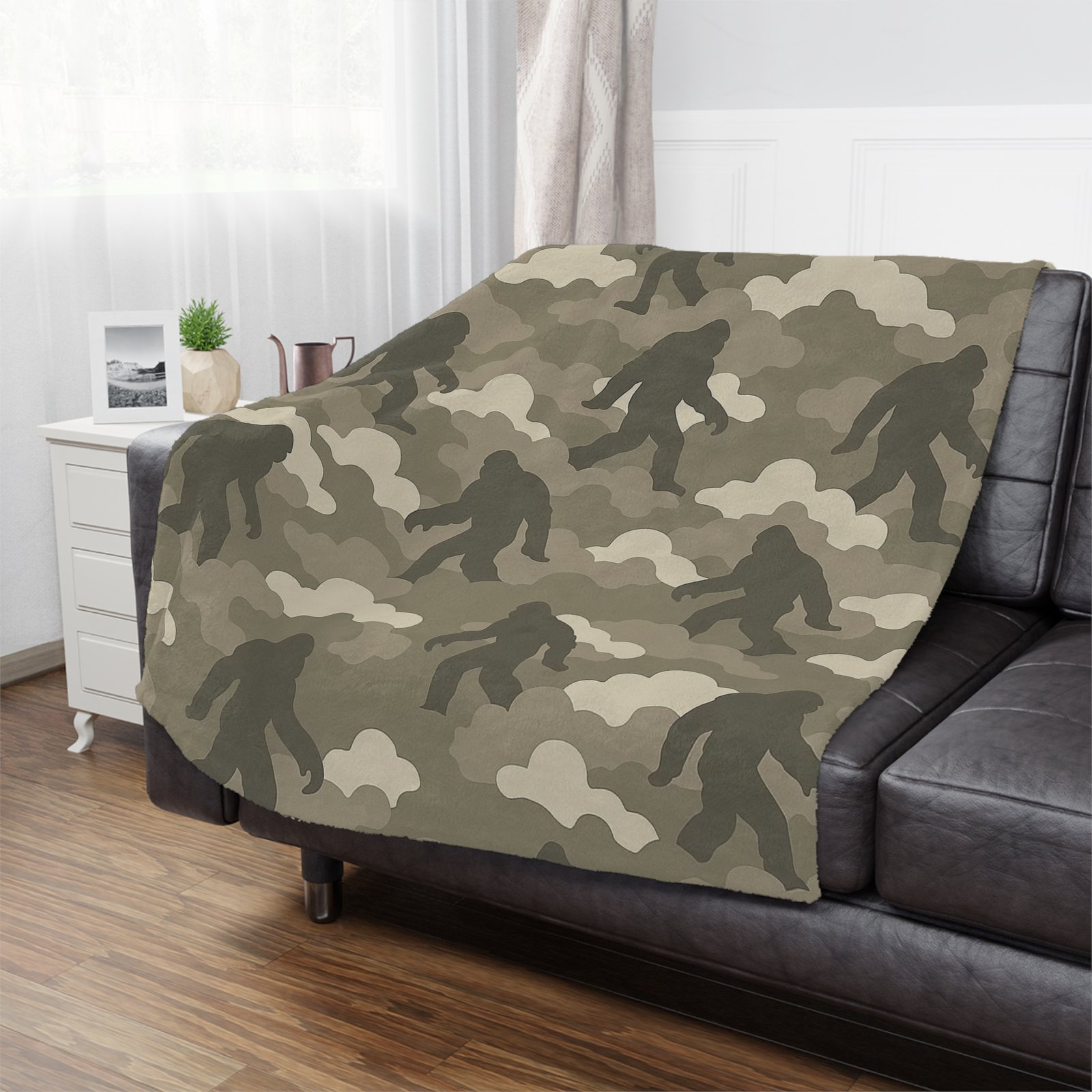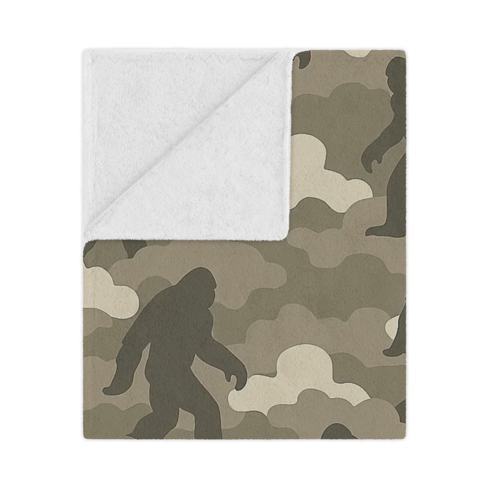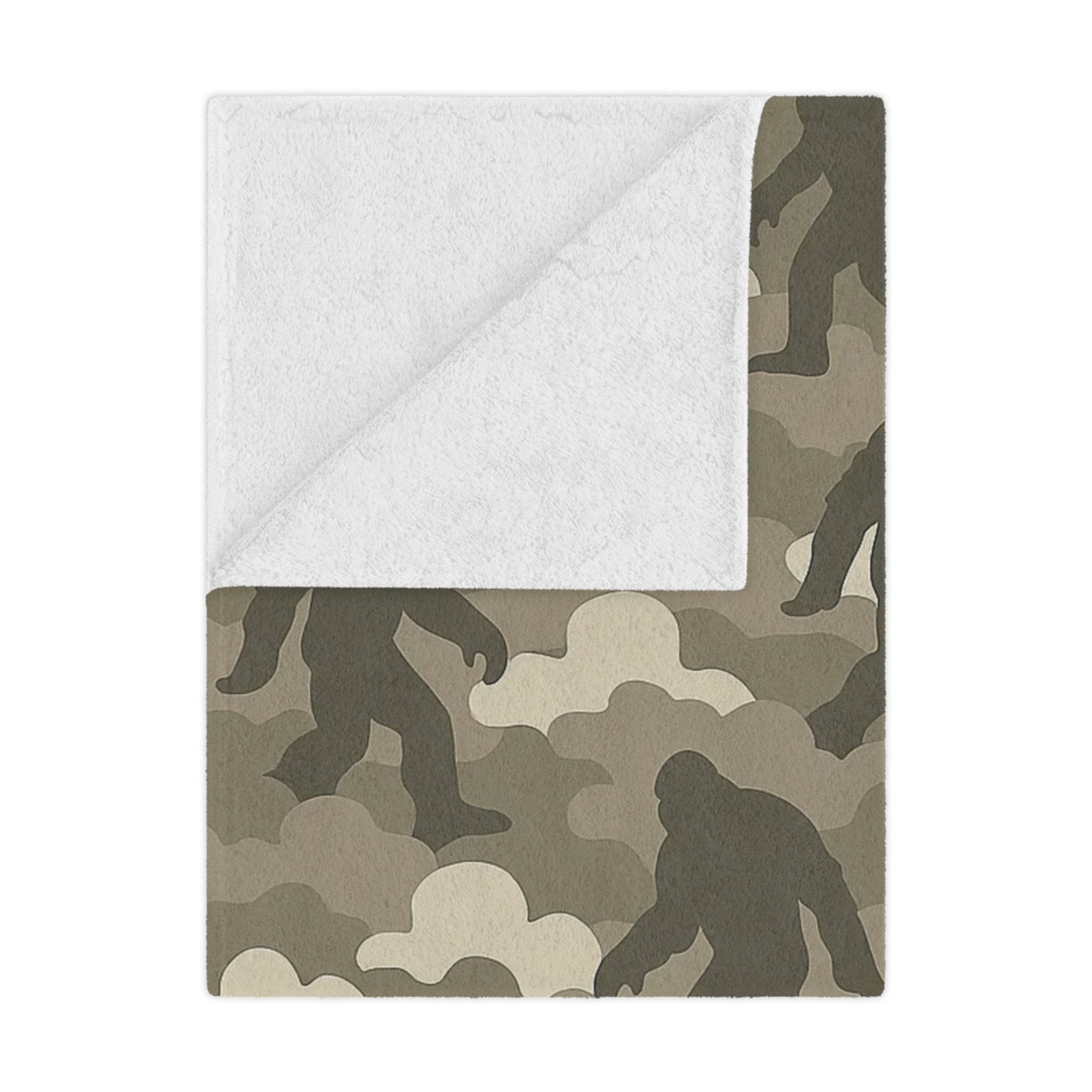 Wrap yourself in legendary comfort with the Bigfoot x Cloud Camo ‘Foggy Footsteps’ neutral camo Minky Blanket. This ultra-soft microfiber fleece throw pairs calming neutral tones with subtle Bigfoot silhouettes hiding throughout the pattern. It’s perfect for anyone who loves cozy nights and legendary adventures.