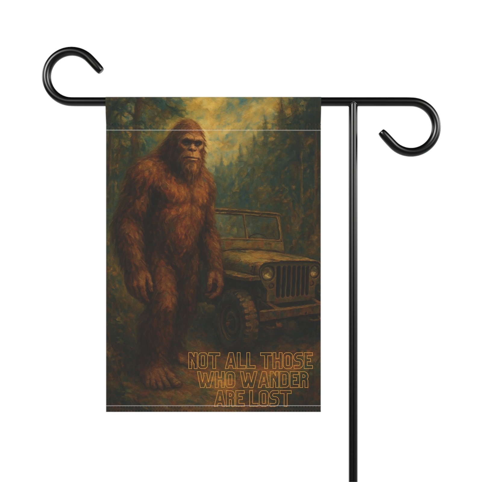 Celebrate the spirit of adventure with the Not All Those Who Wander Are Lost Bigfoot garden flag. This fine art–style design features Bigfoot standing beside an old Jeep deep in the woods, with the iconic phrase “Not All Those Who Wander Are Lost”. Perfect for Jeep lovers, campers, and cryptid fans, this flag turns your yard or patio into a tribute to exploration and legend.