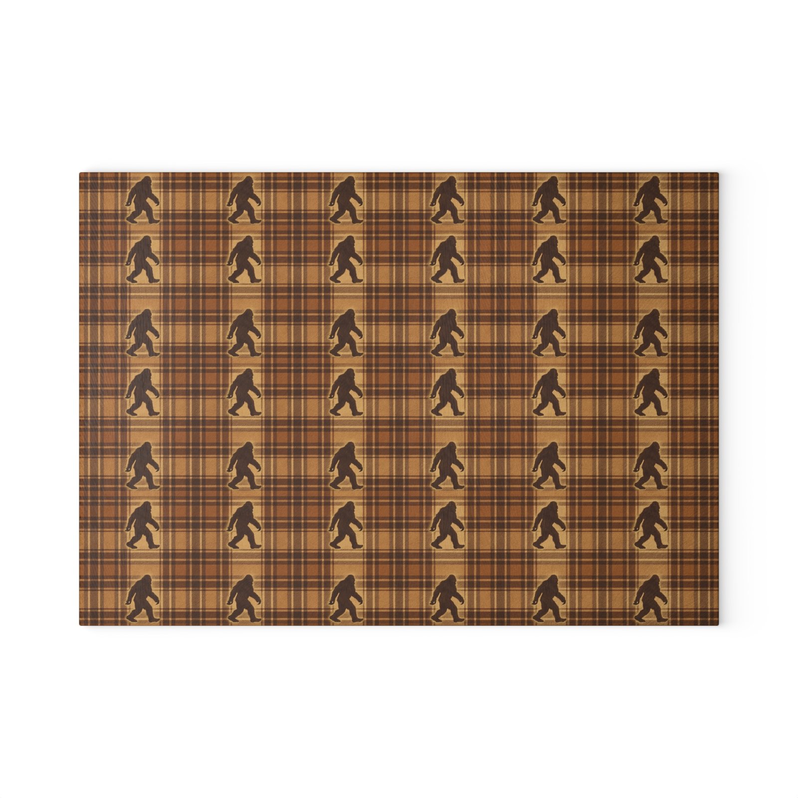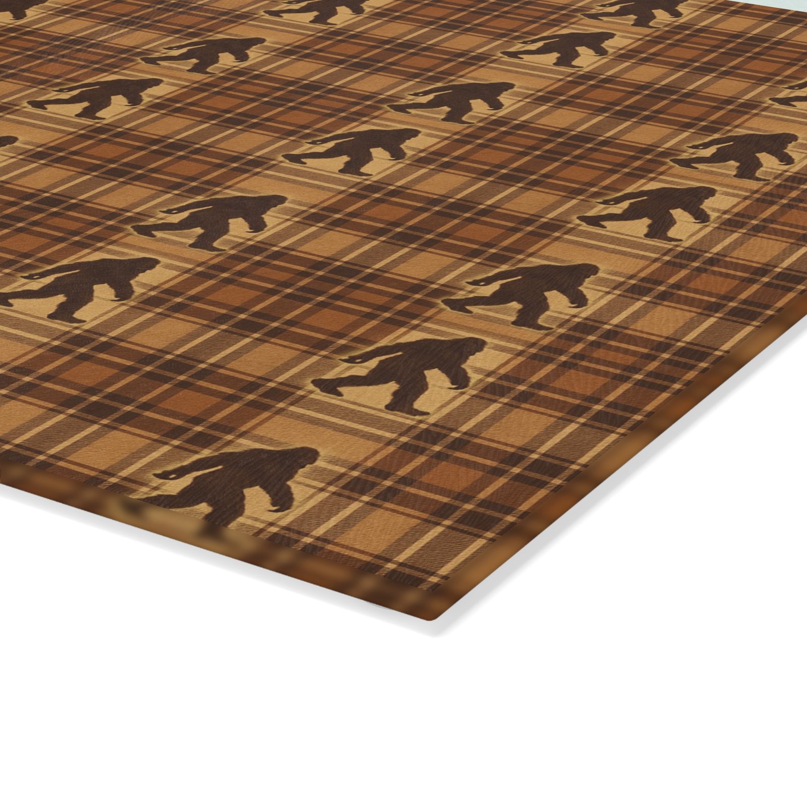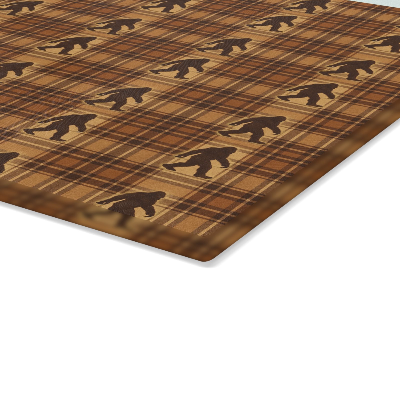 Perfect Plaid Bigfoot Glass Cutting Board, Rustic Elegance with a Cryptid Twist | Conversation Starter | Christmas Gift, Cabin Camper Decor