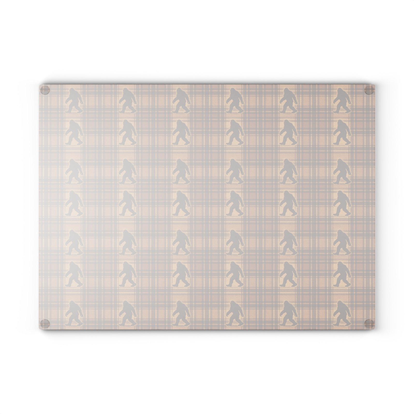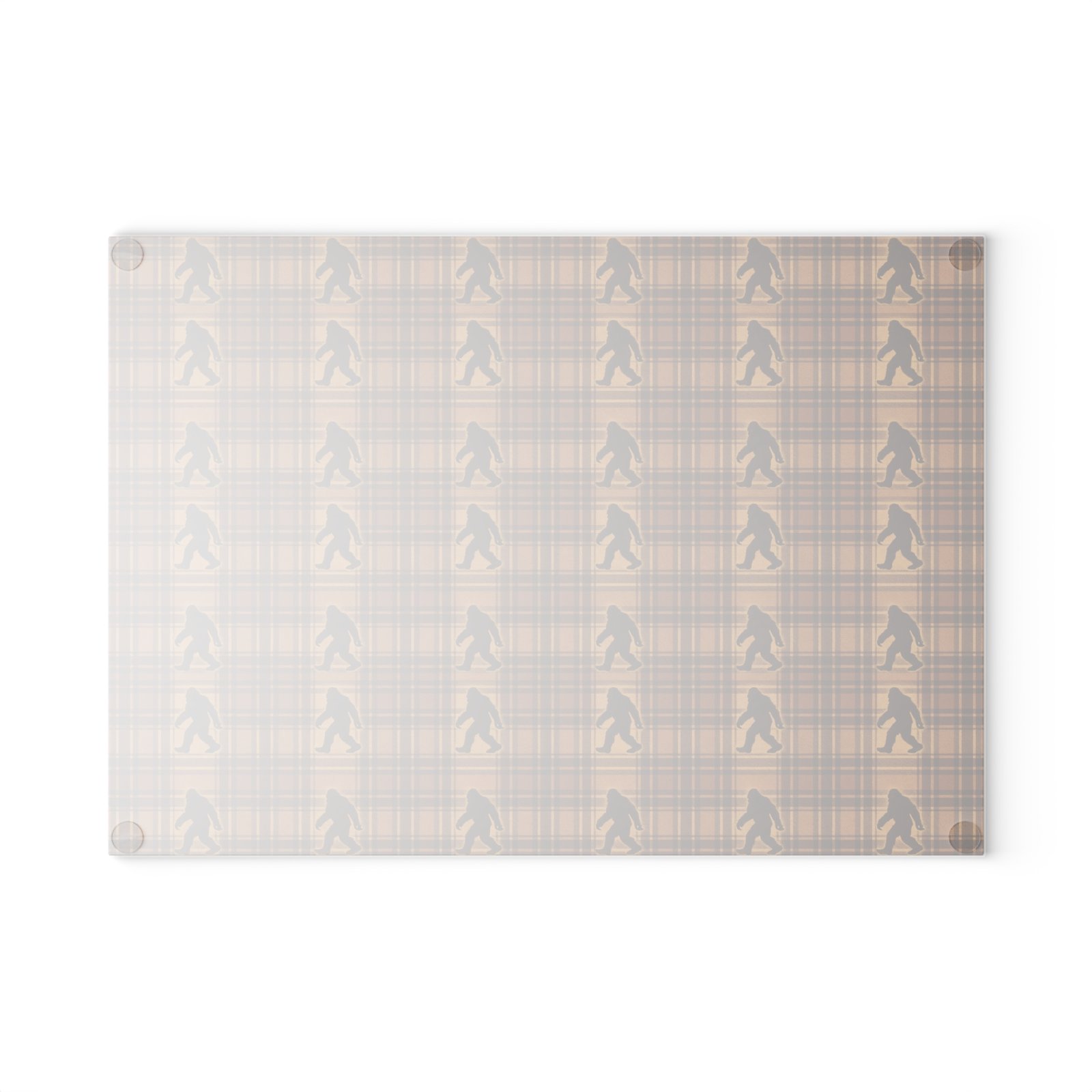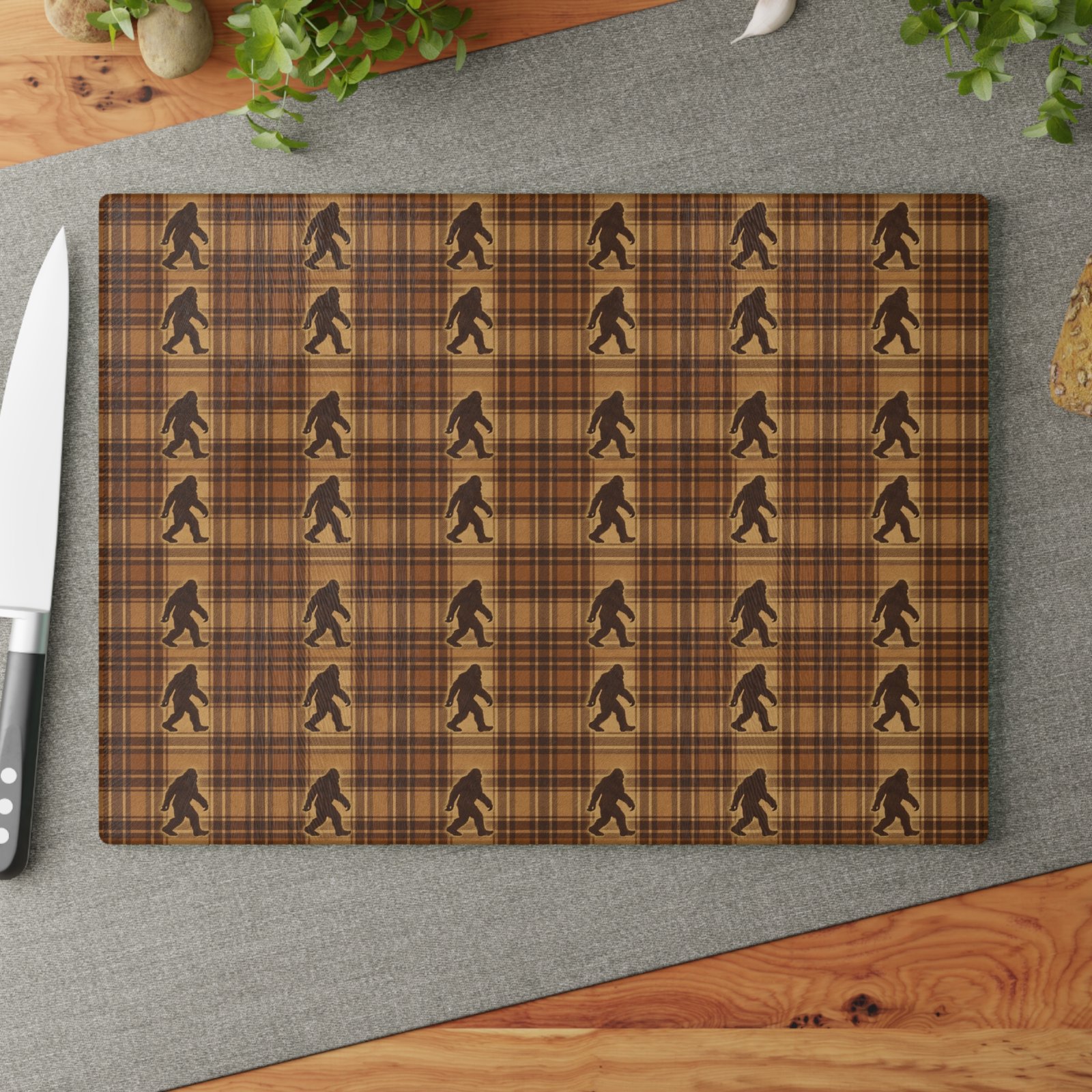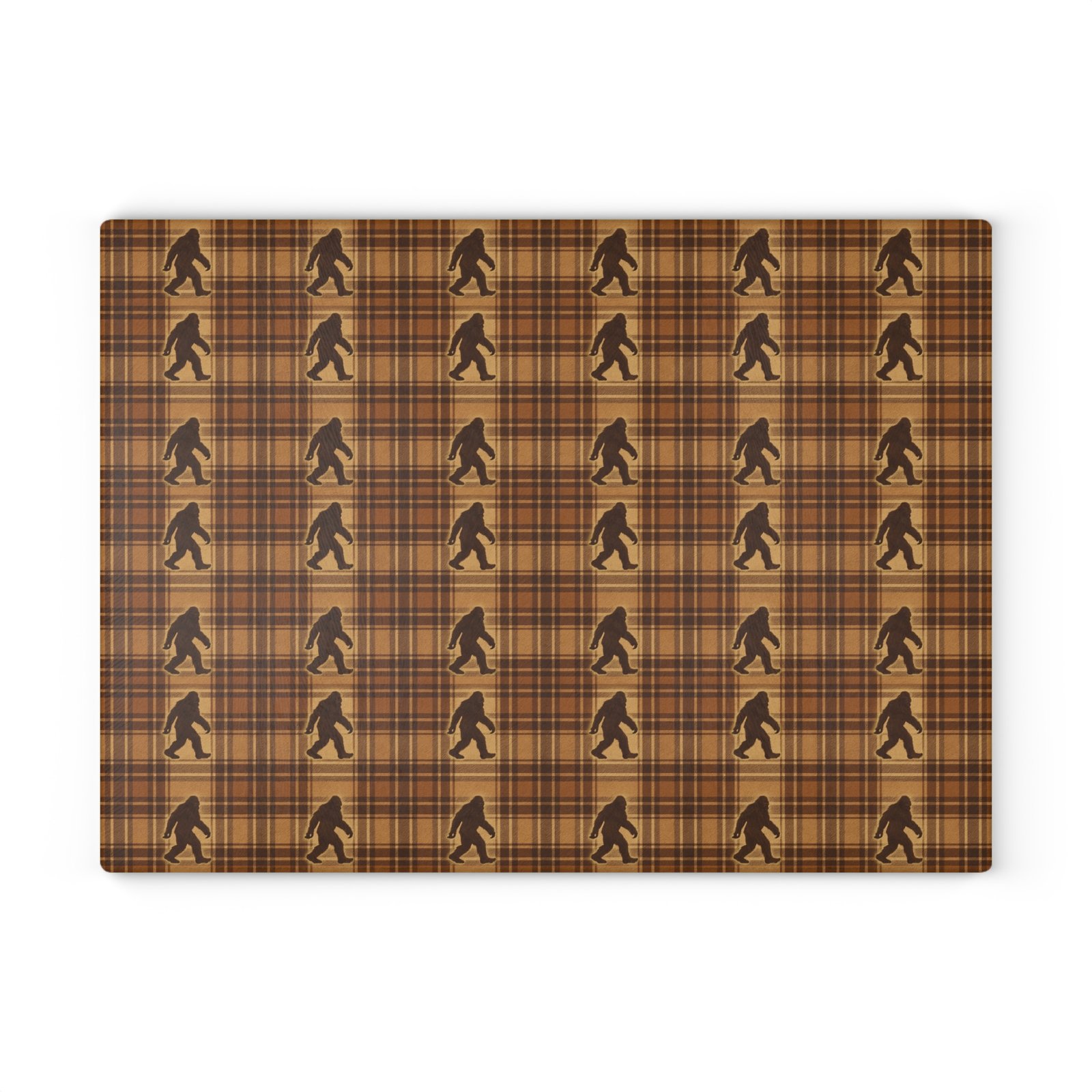 Perfect Plaid Bigfoot Glass Cutting Board, Rustic Elegance with a Cryptid Twist | Conversation Starter | Christmas Gift, Cabin Camper Decor