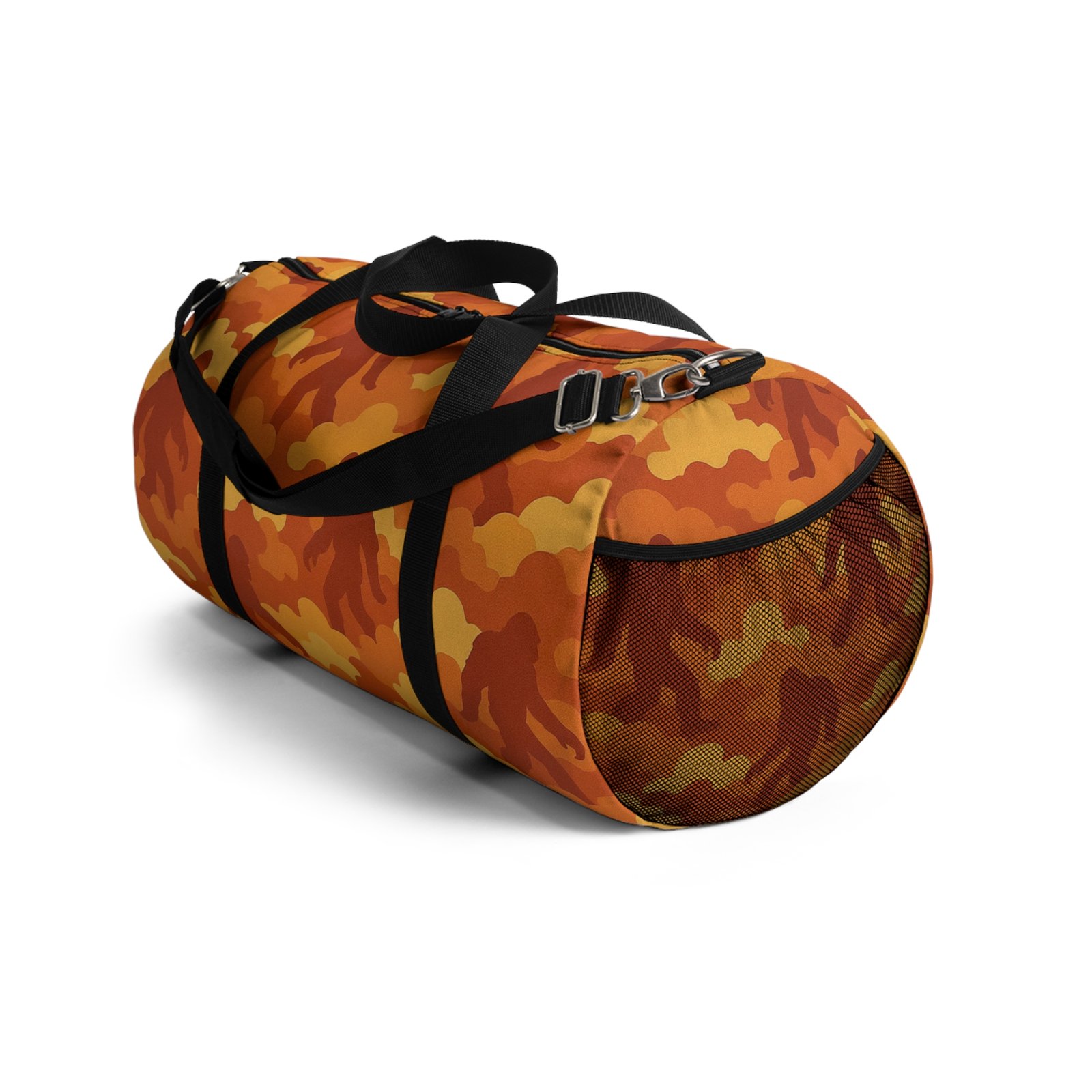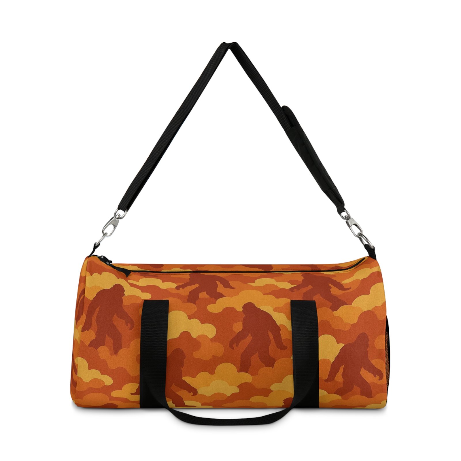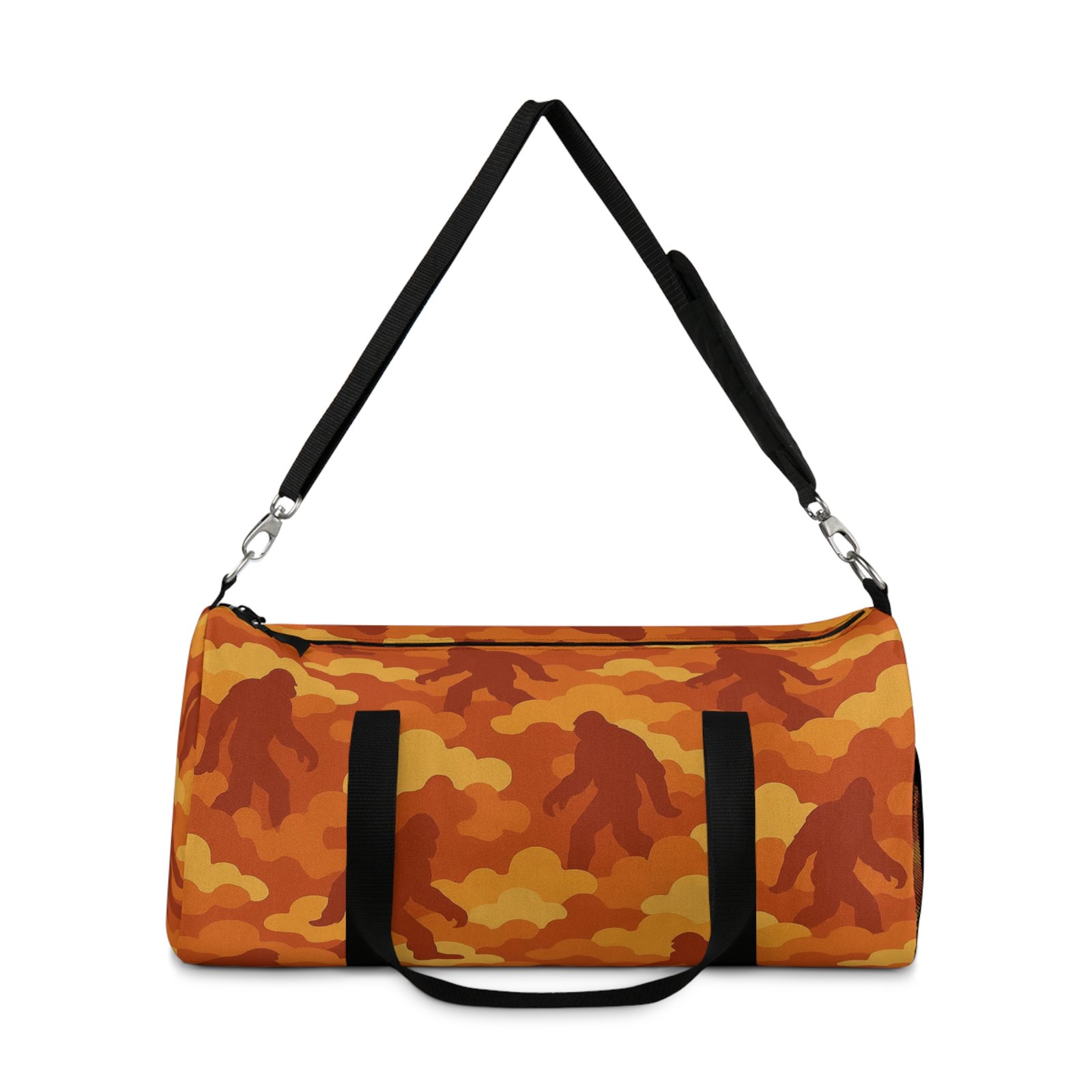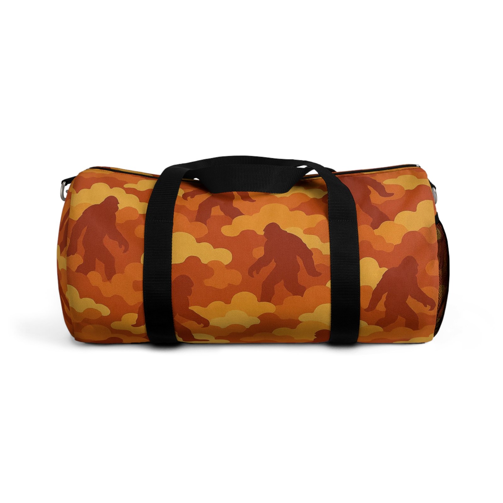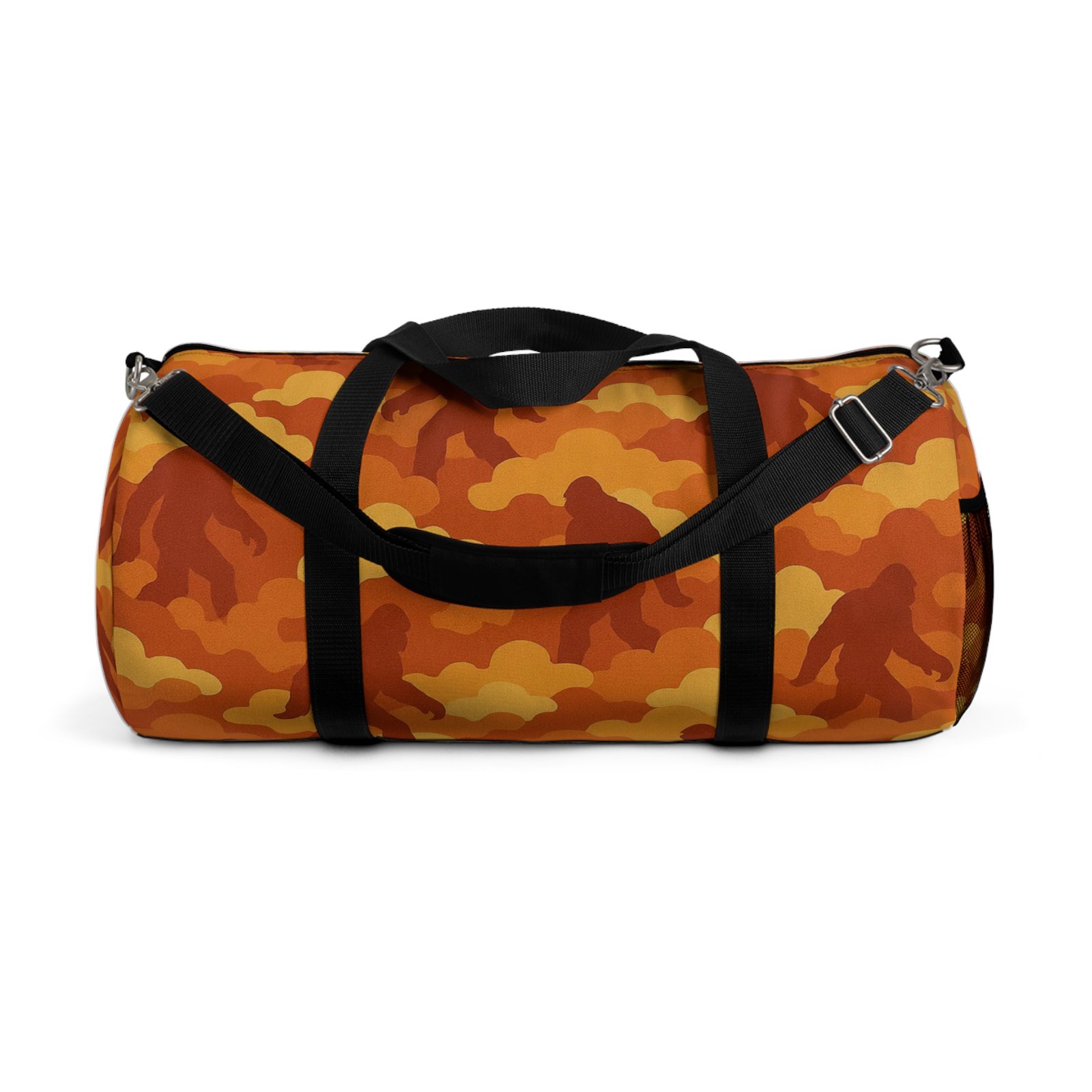 Light the night and pack up for a campfire adventure with the bold Bigfoot cloud camo duffle, “Fireside Blaze”, that glows with fiery ember reds and burnt oranges. Sasquatch roams throughout the pattern, bringing campfire mystique and rugged durability anywhere you explore.