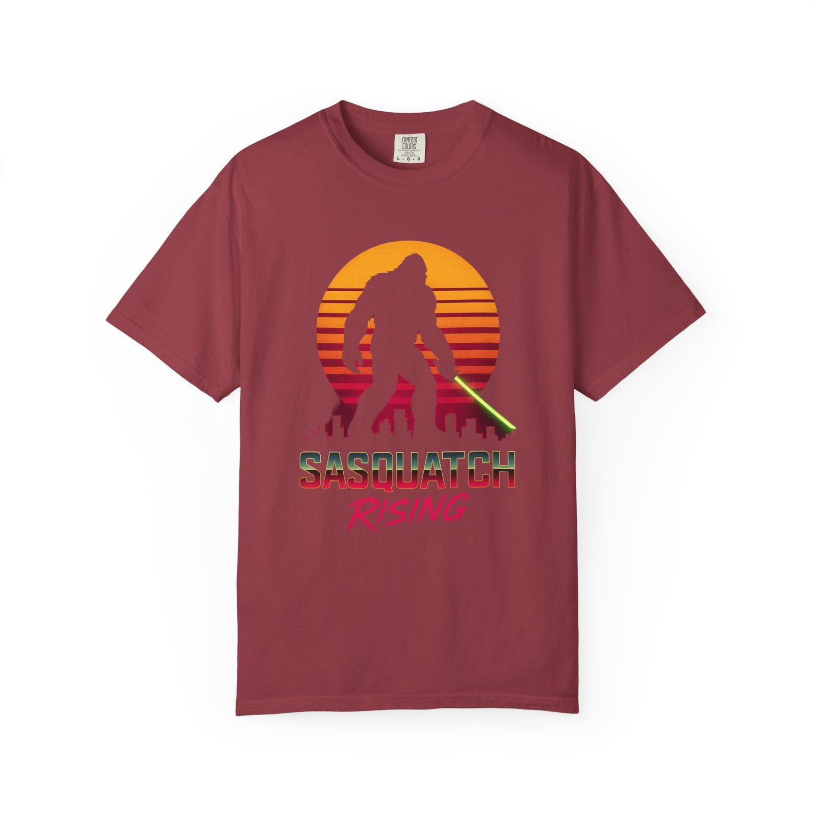 With its bold silhouette and the phrase “Sasquatch Rising” glowing across the design, this shirt channels retro arcade posters, martial arts movie covers, and 80s synthwave dreamscapes.