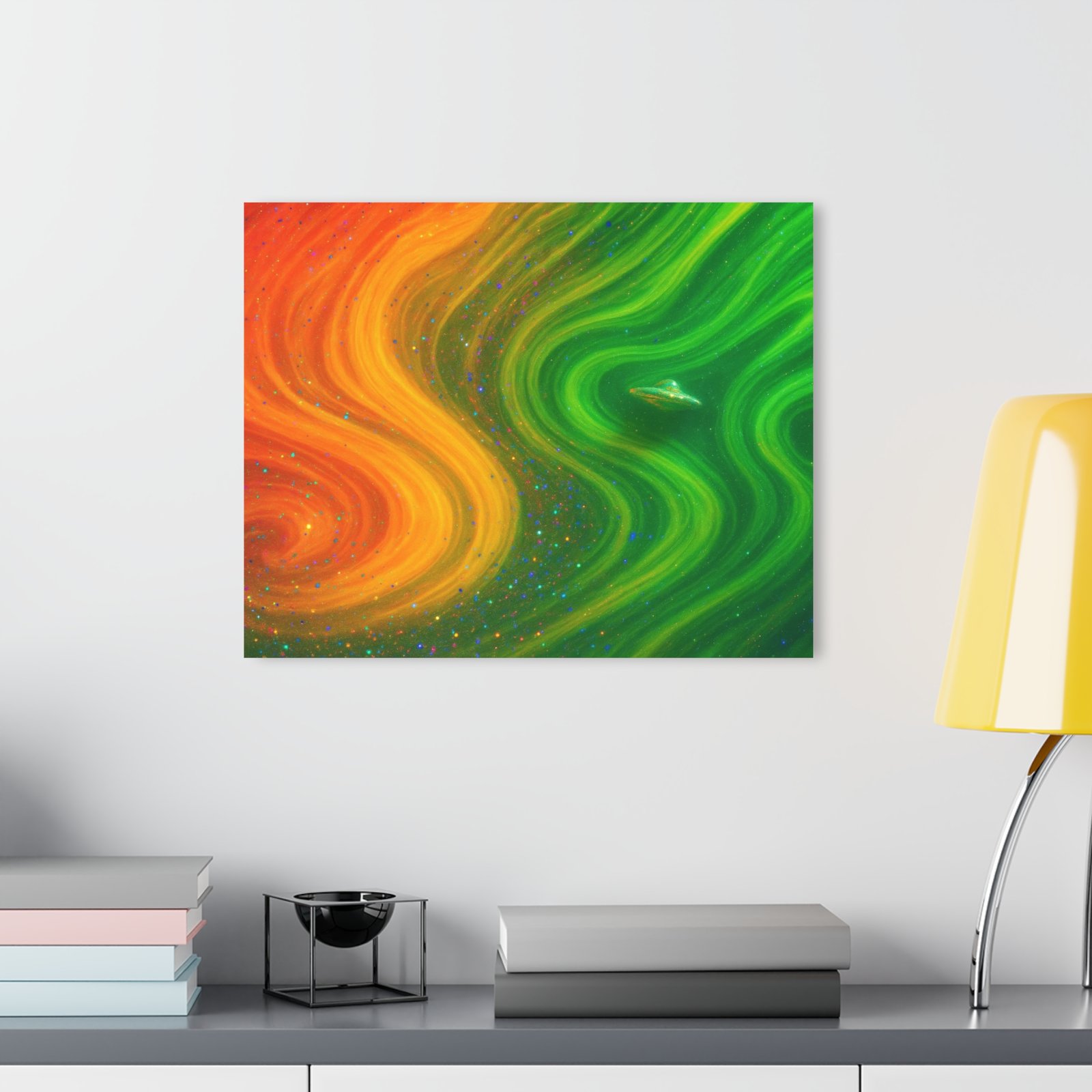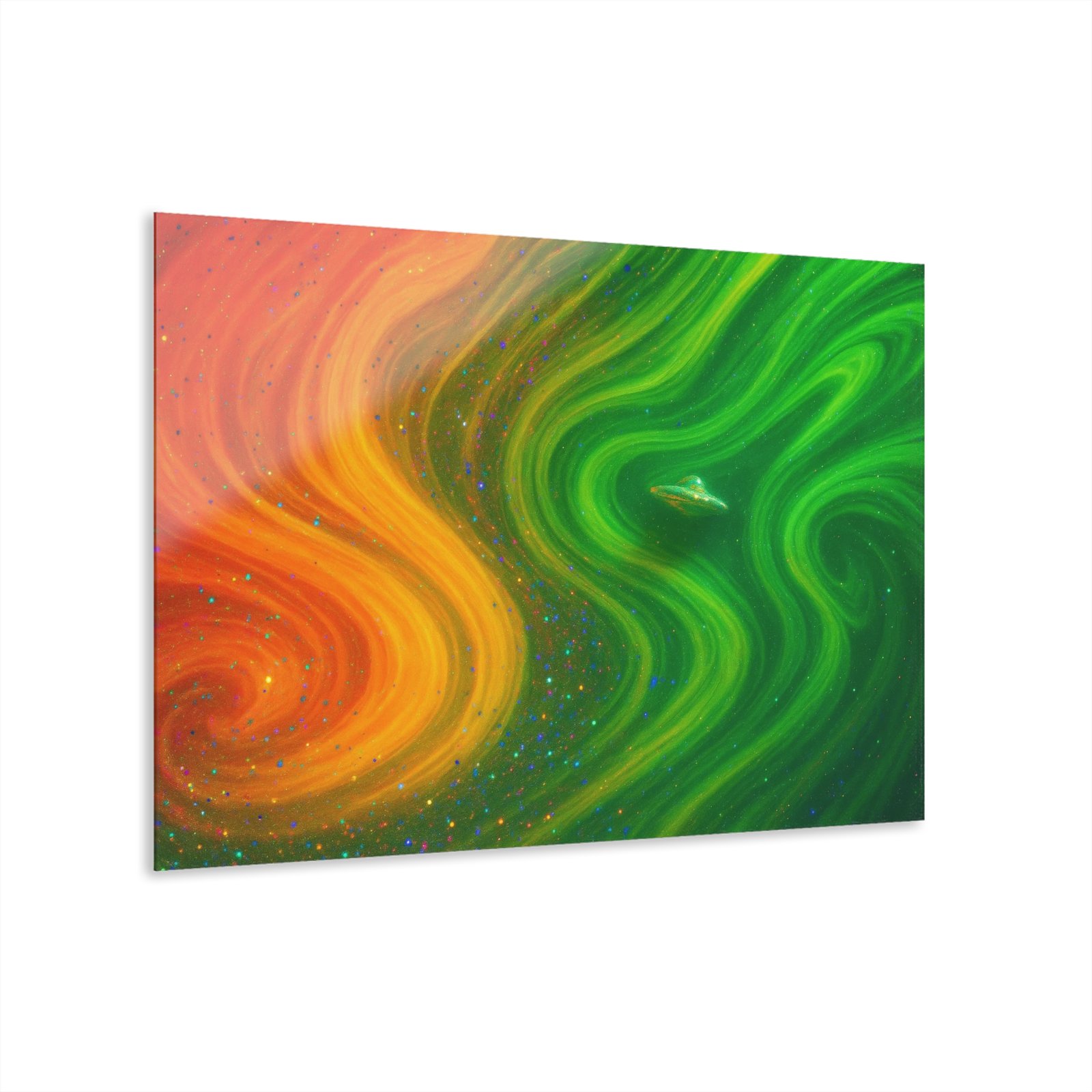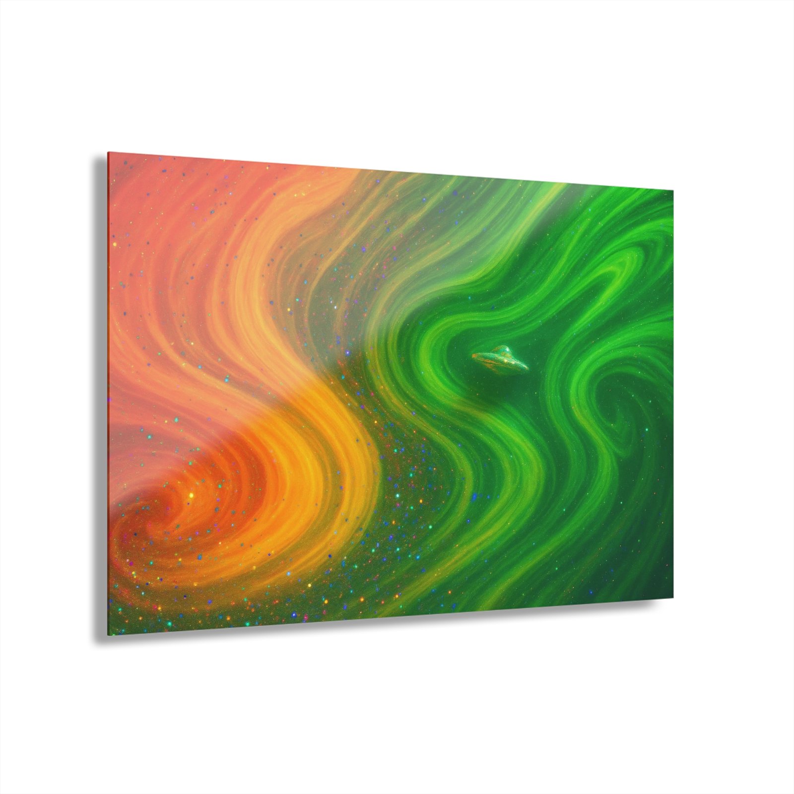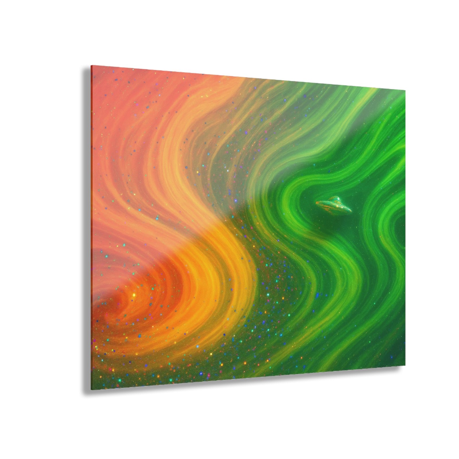 Step into the cosmic rhythm of the mesmerizing “Galactic Groove” gallery quality UFO wall art piece that fuses mystery, motion and modern design – available in 4 sizes. This premium acrylic print captures a luminous extraterrestrial spacecraft gliding through a sparkling orange and green galaxy, its path alive with light and depth.