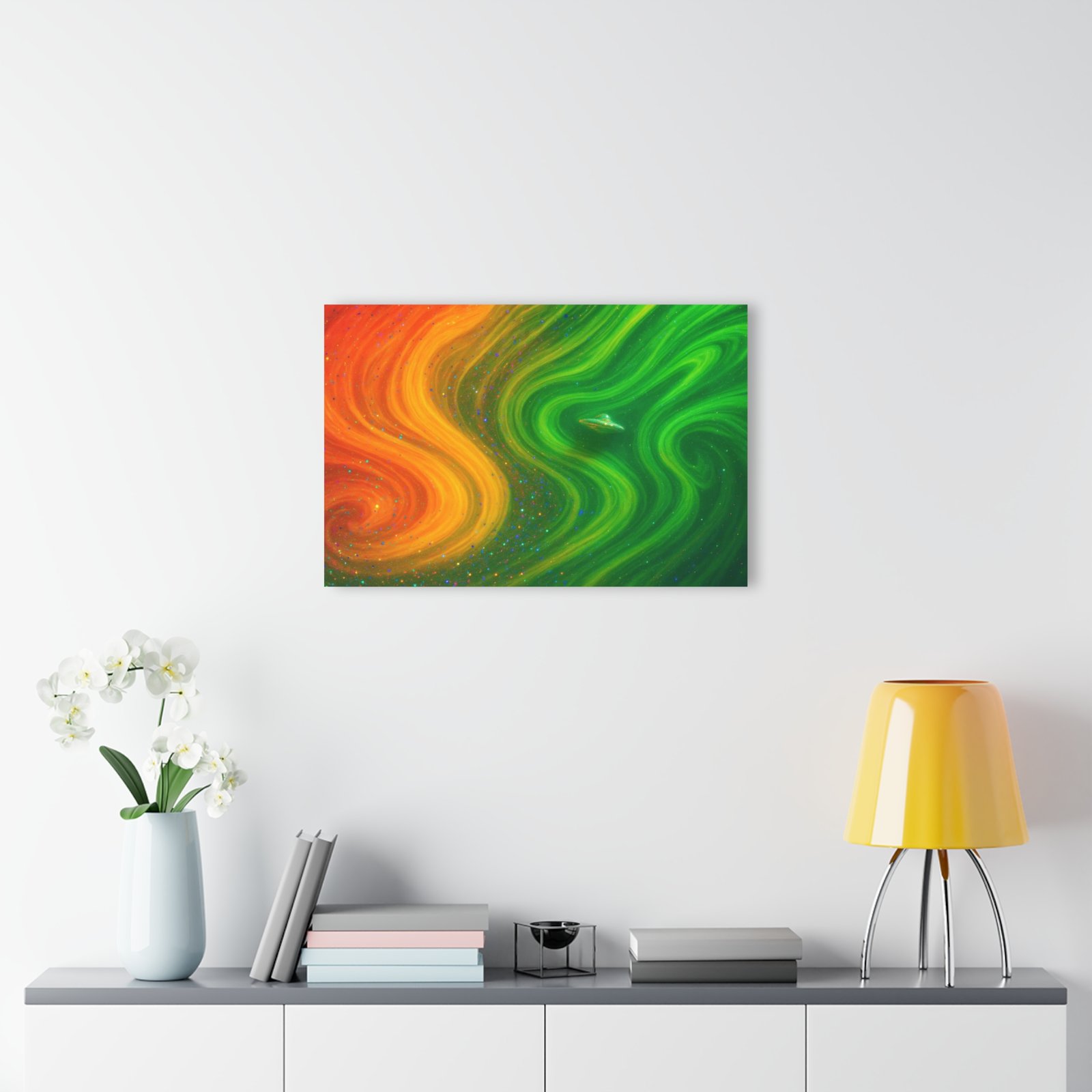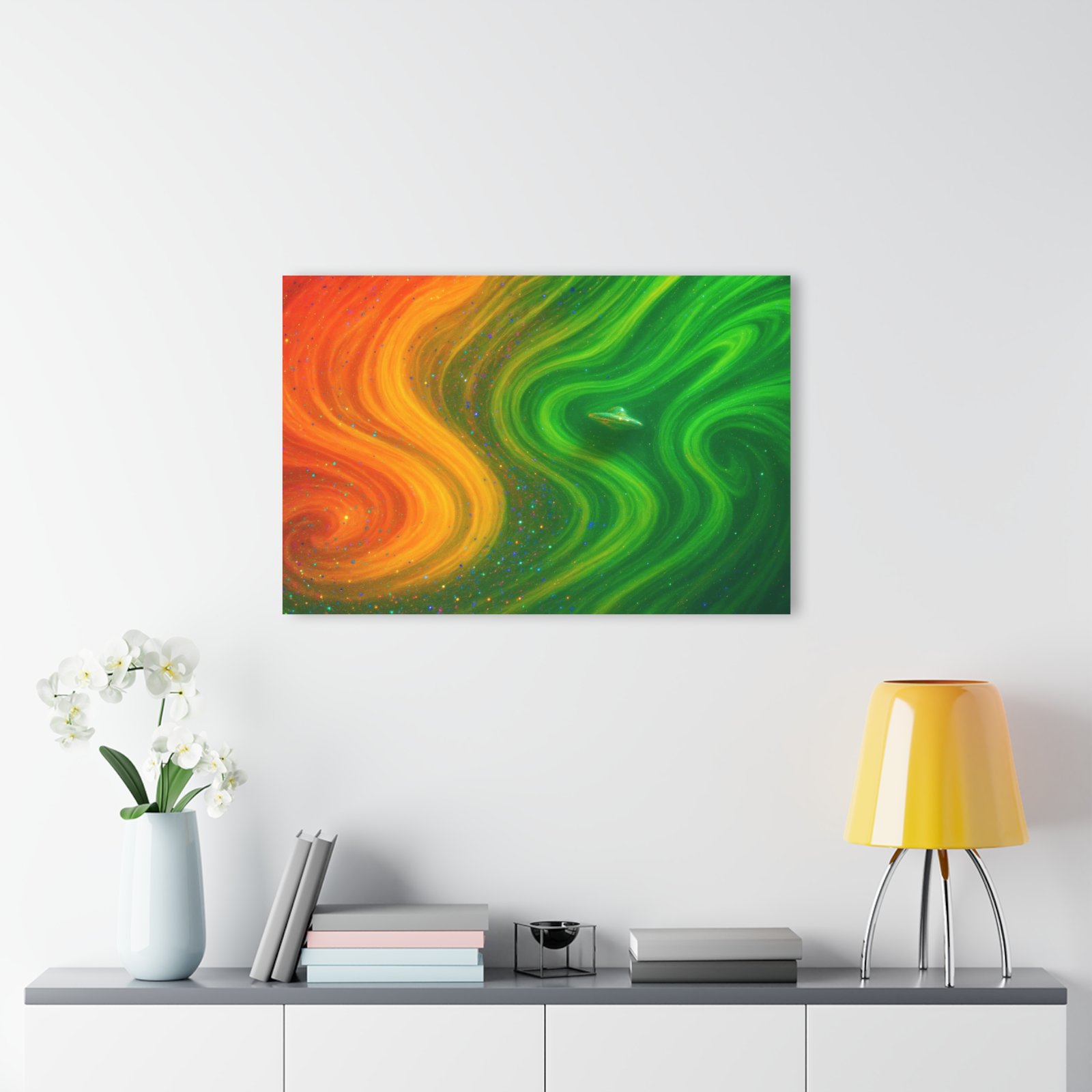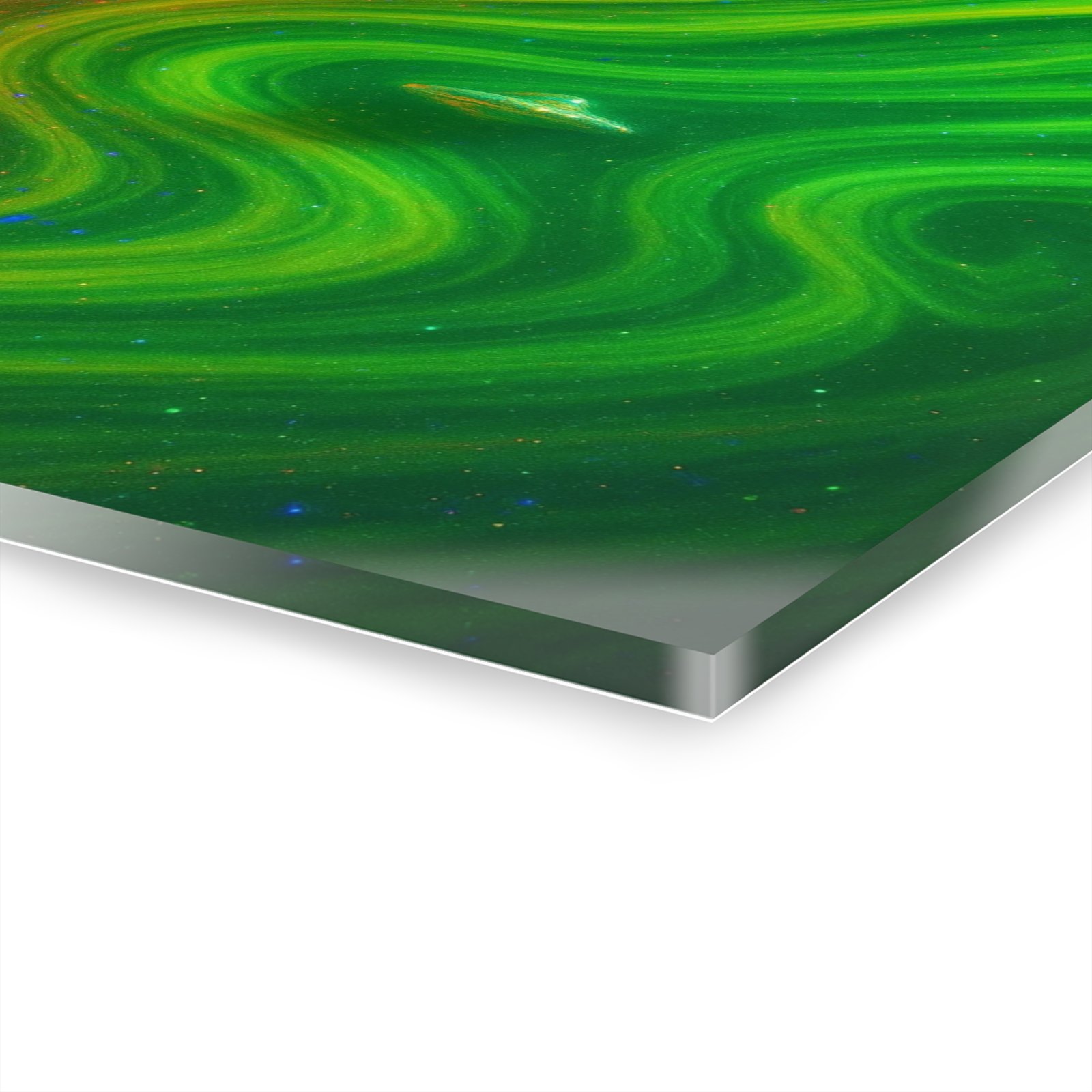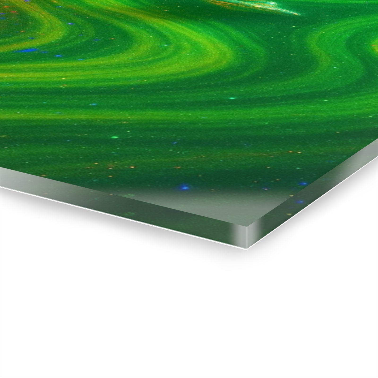 Step into the cosmic rhythm of the mesmerizing “Galactic Groove” gallery quality UFO wall art piece that fuses mystery, motion and modern design – available in 4 sizes. This premium acrylic print captures a luminous extraterrestrial spacecraft gliding through a sparkling orange and green galaxy, its path alive with light and depth.
